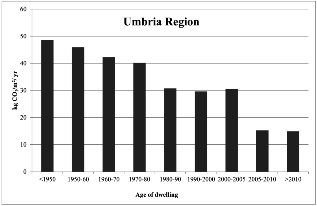 In this study, CO2 emission estimates were calculated by using CO2 indicators available on energy certificates for each dwelling, which correspond to the amount of CO2 emissions due to energy use for heating and for hot water, expressed in kgCO2/(m2year). On the basis of these values, the average value of CO2 emissions was calculated as the mean of the CO2 indicators related to about 3200 energy certificates for residential dwellings in Umbria (corresponding to 2% of the total regional housing stock [,]).