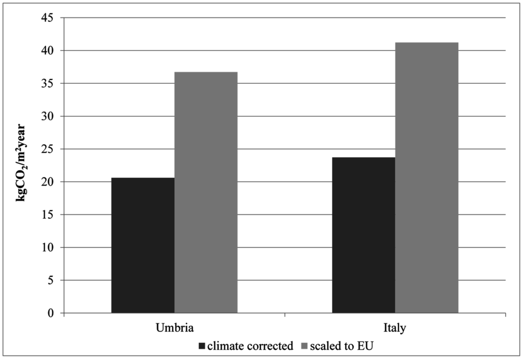 Average CO2 emissions per useful floor area for Umbria and Italy: comparison between climate corrected and EU scaled data.