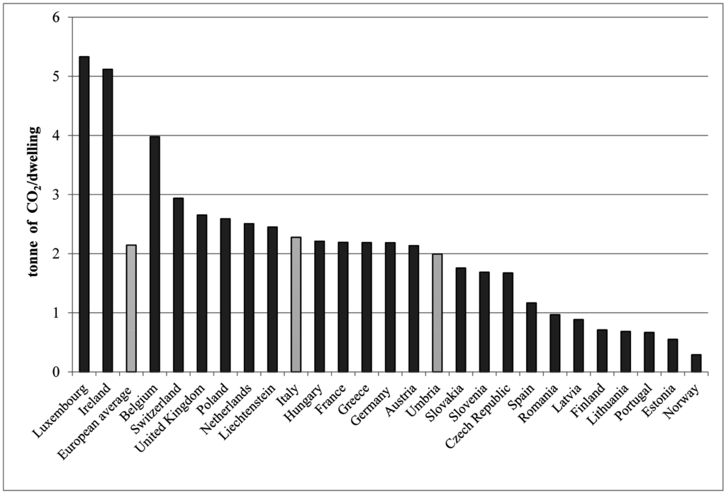Finally, the calculated CO2 emissions per dwelling were compared to the mean values of European countries; this comparison is shown in Figure 9. The mean value of Umbria is lower than the mean value of European countries, with a difference of about 2 tons of CO2 per dwelling, and it is very close to the Italian mean value.