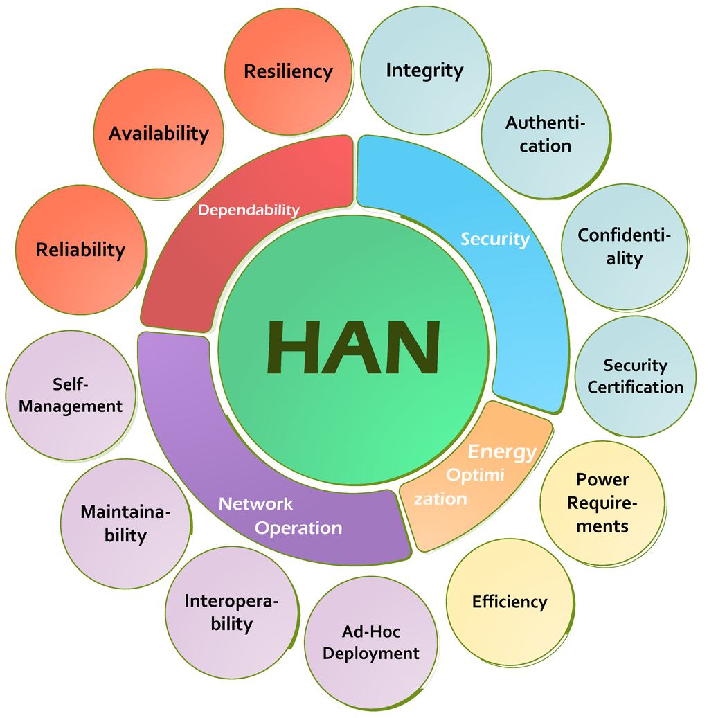 The communication requirements related to HAN are defined by the services and applications which run in the household; for example, diverse processes have to be executed among all devices in a smart home network. According to this condition, HAN have to provide reliable communication between application area devices and from the functional area devices to HAN devices for different indoor scenarios. If such is the case, then all HAN devices have to be dependably accessible as well.