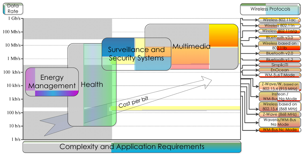 Despite Isa100.11 and WirelessHART being designed for the industry sector, they were selected merely as a comparison factor, but these networks can also fit for several home automation tasks, alarms, switches, smoke detectors, energy management of appliances such as heater and cooler, oven among others. Insteon and EnOcean have serious limitations in terms of guaranteeing a minimally secure communication; besides, they have a low data rate. The remaining low power data rate networks, when eligible, present similar technical specifications; thus, the selection has to undergo an analysis of development, installation and operational cost. Consequently, it is necessary to study which are the implementation memory, CPU requirements, and the wireless protocol, and analyse the energy profile according to data traffic.