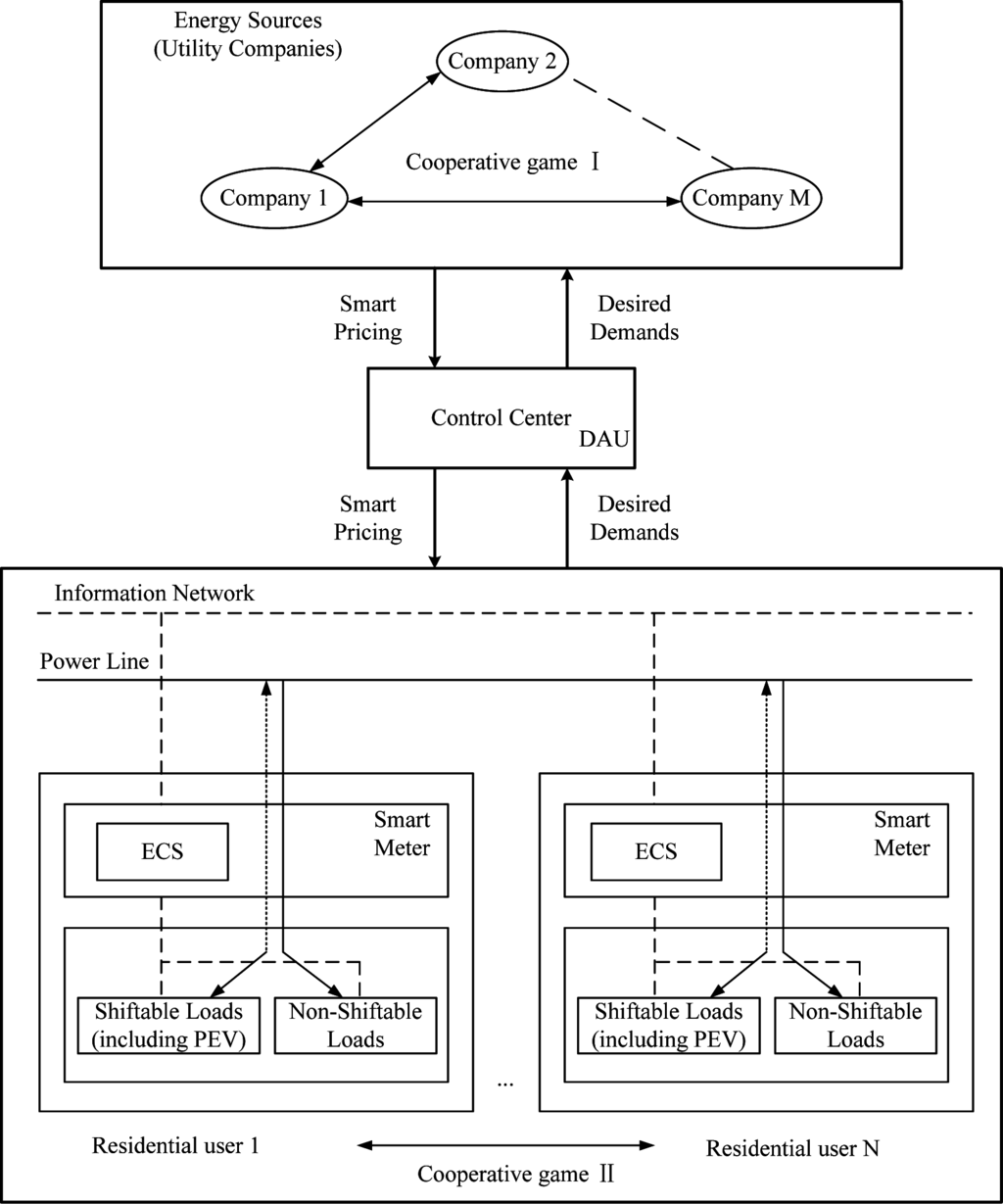 Current game-theoretic approaches for DSM programs have been focused on the interaction between a utility company and end users, such as in [29], Yang et al. provided a game-theoretic approach to optimize the ToU pricing for utility companies with a single-user-type scenario and a scenario with multiple users. The proposed game-theoretic method can benefit both the utility company and the users by obtaining a Nash equilibrium. Another smart pricing scenario based on the Vickrey–Clarke–Groves mechanism was analyzed with the game-theoretic method in [30]. Tushar et al. [31] focused on the energy exchange between a utility company and PEVs, and a noncooperative game was developed to optimize a tradeoff between the benefit of battery charging and associated costs; while in [32], the authors focus on the interactions among the end users by formulating cooperative game-theoretic ECS for residential users. The proposed method can not only cut down the total cost of all users, as well as each users electricity payment, but also reduce the value of the peak-to-average ratio (PAR). Moreover, the authors in [2] introduced the concept of fairness into the users’ utility functions, then designed new autonomous demand response systems that can achieve both optimality and fairness with a smart electricity billing mechanism.