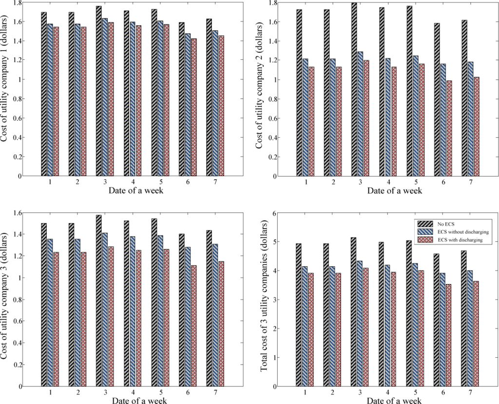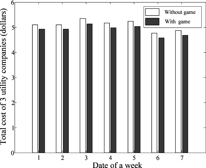 Figure 2 shows the total cost of three utility companies in a week when there is no cooperative game among residential users. From the figure, one can see that the total cost of the three utility companies is reduced everyday when the game among the utility companies is involved. In another words, the utility companies will benefit when they are cooperating with each other regardless of whether the residential users optimize their appliances’s scheduling or not. Moreover, when the double game among utility companies and residential users is considered, the cost of utility companies should be reduced further. As shown in Figure 3, one can see that the cost of each utility company or the total cost of all three utility companies keeps decreasing when residential users take part in the cooperative game and discharge energy back with their PEVs. Therefore, the double cooperative game will benefit the utility companies more than only the cooperative game employed among themselves.