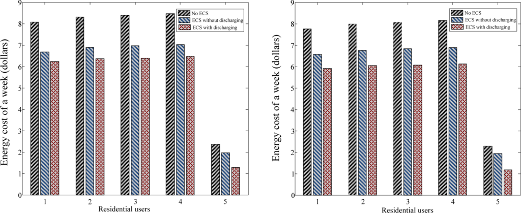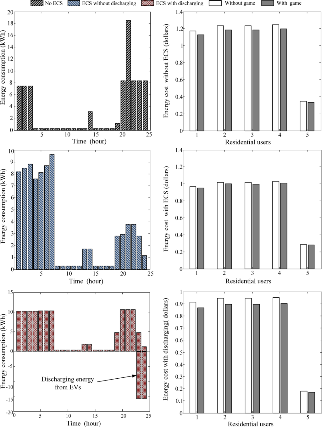To illustrate daily energy consumption and the cost of residential users among the double cooperative game, simulation results on Friday for the five residential users are presented as shown in Figure 4. The left column of the figure shows the total energy consumption of the five residential users for the cases of no ECS, ECS without discharging and ECS with discharging, from top to bottom, respectively. One can see that when the cooperative game among users is employed, some shiftable loads have been shifted to the duration with lower electricity price, i.e., from 0:00 to 7:00, compared to the case of no cooperative game among the users. Additionally, when PEVs are allowed to store and discharge energy back to the grid, the PEVs will be charged at a lower electricity price and discharged at a high electricity price, which is from 23:00 to 24:00, as shown in the figure. The right column of Figure 4 shows the cost of each residential user on Friday for the cases of no ECS, ECS without discharging and ECS with discharging, from top to bottom, respectively. For each case of the residential user, two cases of utility companies are also considered to calculate the cost. One can see that the payments of each residential user decrease monotonically along with the combined cases: “no ECS” and “without game”, “no ECS” and “with game”, “ECS without discharging” and “without game”, “ECS without discharging” and “with game”, “ECS with discharging” and “without game” and “ECS with discharging” and “with game”.