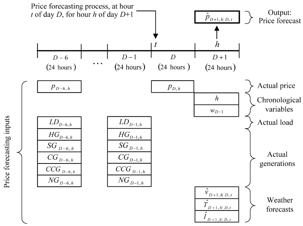From the recorded information of explanatory variables, hourly values of actual Iberian aggregated power demand and generation of different types of power plants, and by applying a time series autocorrelation analysis of these variables [], some explanatory information was identified for lags of 48 and 168 h; thus, in accordance with such analysis, in Figure 1, several variables for hour h of day D – 1 and for hour h of day D – 6 were included: power demand (LD), hydropower generation (HG), solar power generation and power cogeneration (SG), coal power generation (CG), combined cycle power generation (CCG), and nuclear power generation (NG). It should be noticed that information for a lag of 24 h was not included since those generation variables were not available for day D. Similarly, from time series analysis, the price pD,h, at hour h of day D and the price pD – 6,h of day D – 6 were included; in this case, the prices for all the hours of day D were known because they were fixed in day D – 1. Lastly, from the results of the autocorrelation analysis, wind power generations (WG) from day D – 6 to day D – 1 were not considered in the time framework of the EMPF model.