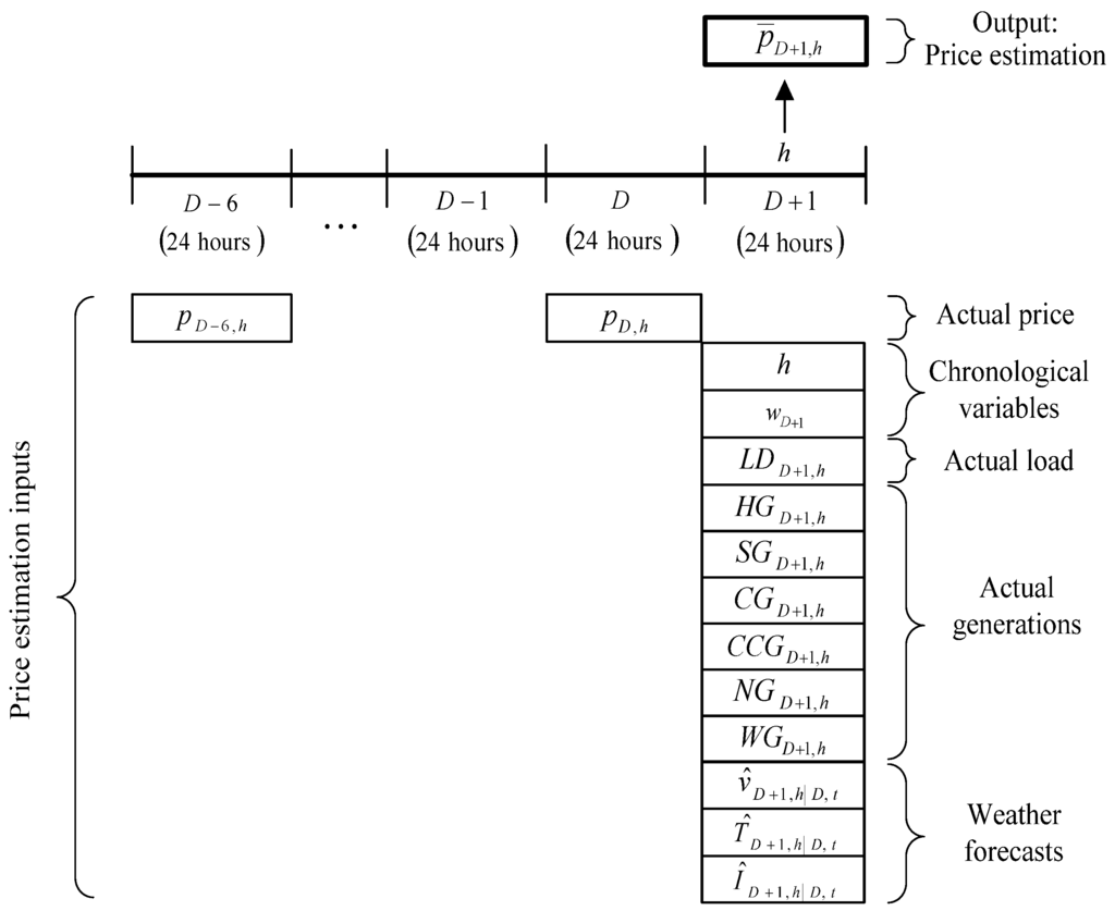 The time framework for price estimation of the REMPE model is given in Figure 2, showing the major differences between this model and the EMPF model. A part of the input variables of the REMPE model (mainly actual power generations and power demands of day D + 1) as well as its output variable (price estimation ), are different from the input variables of the EMPF model (principally actual power generations and power demands of day D – 1 and the ones of day D – 6), as well as its output variable (price forecast ). Thus, the REMPE model is not a forecasting model but a model for hourly price estimation. Lastly, notice that the wind power generation (WG) of day D + 1 is an input of the REMPE model.