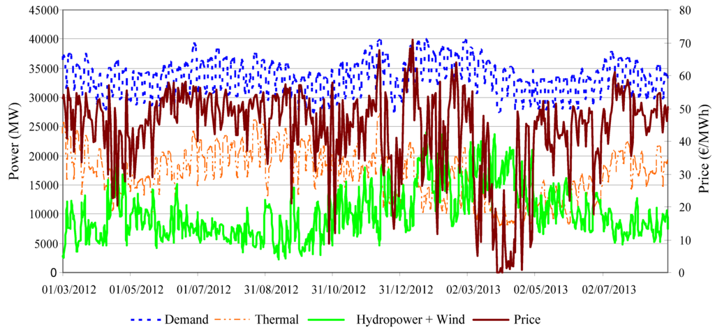 - Power market restriction variables: unavailable capacity for power generation, reserves of power generation and interconnection, volume of electric energy allocated in other electricity markets, and electricity futures market and bilateral contracts. This is inside information, whose usefulness and usability have not been studied yet and it was therefore beyond the scope of this paper.