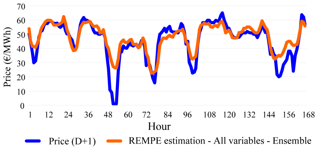 where Preal_T is the real hourly price value, Pestimation_T is the estimation of the hourly price value obtained from the explanatory model, and N is the number of elements of the out-sample data set. The MAPE error value corresponding to the final ensemble result achieved by the REMPE model was 10.23%.