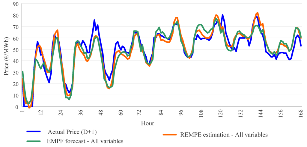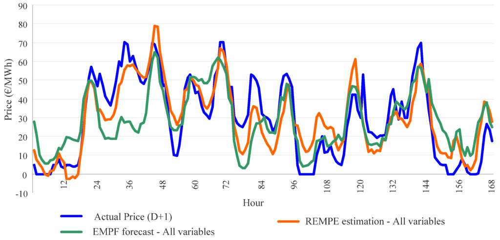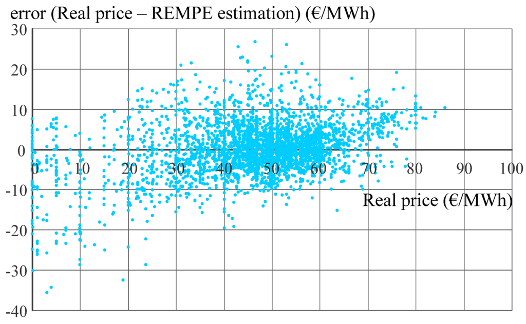 - An innovative Reference Explanatory Model for Price Estimation (REMPE model) for hourly price estimations based on actual power multi-generations and actual power demands of such day, that is, based on real data of explanatory variables. It allows the calculation of the best hourly price estimations and the corresponding error that represents the lowest limit of forecast error values reachable with the used explanatory variables. It should be noticed that the REMPE model is not a forecasting model because actual information of multi-generations and power demands are not available for day-ahead hourly price forecasting. As shown later (Section 3), this REMPE model will determine the lowest limit of the forecasting error than the EMPF model could achieve what will allow evaluating the quality of the forecasting performance of the EMPF model.