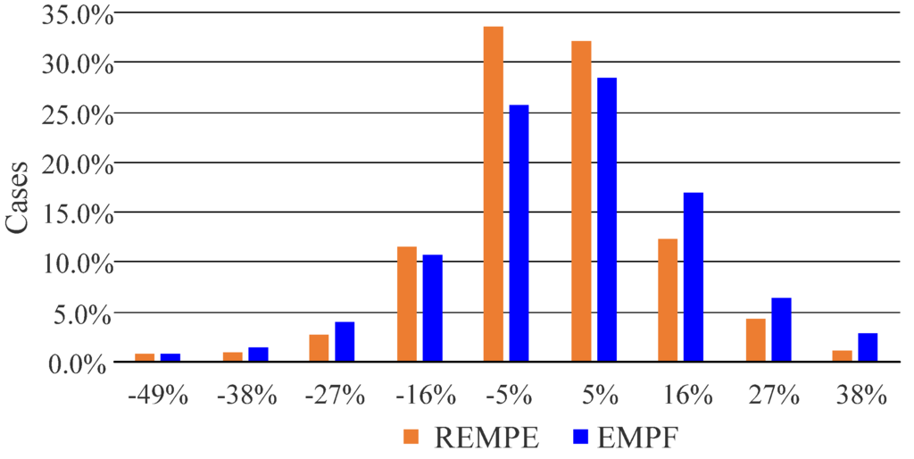 An error analysis for the REMPE model using the mean absolute percentage error (MAPE) was carried out in the price estimations corresponding to the out-sample data set, where the MAPE is defined by Equation (1),