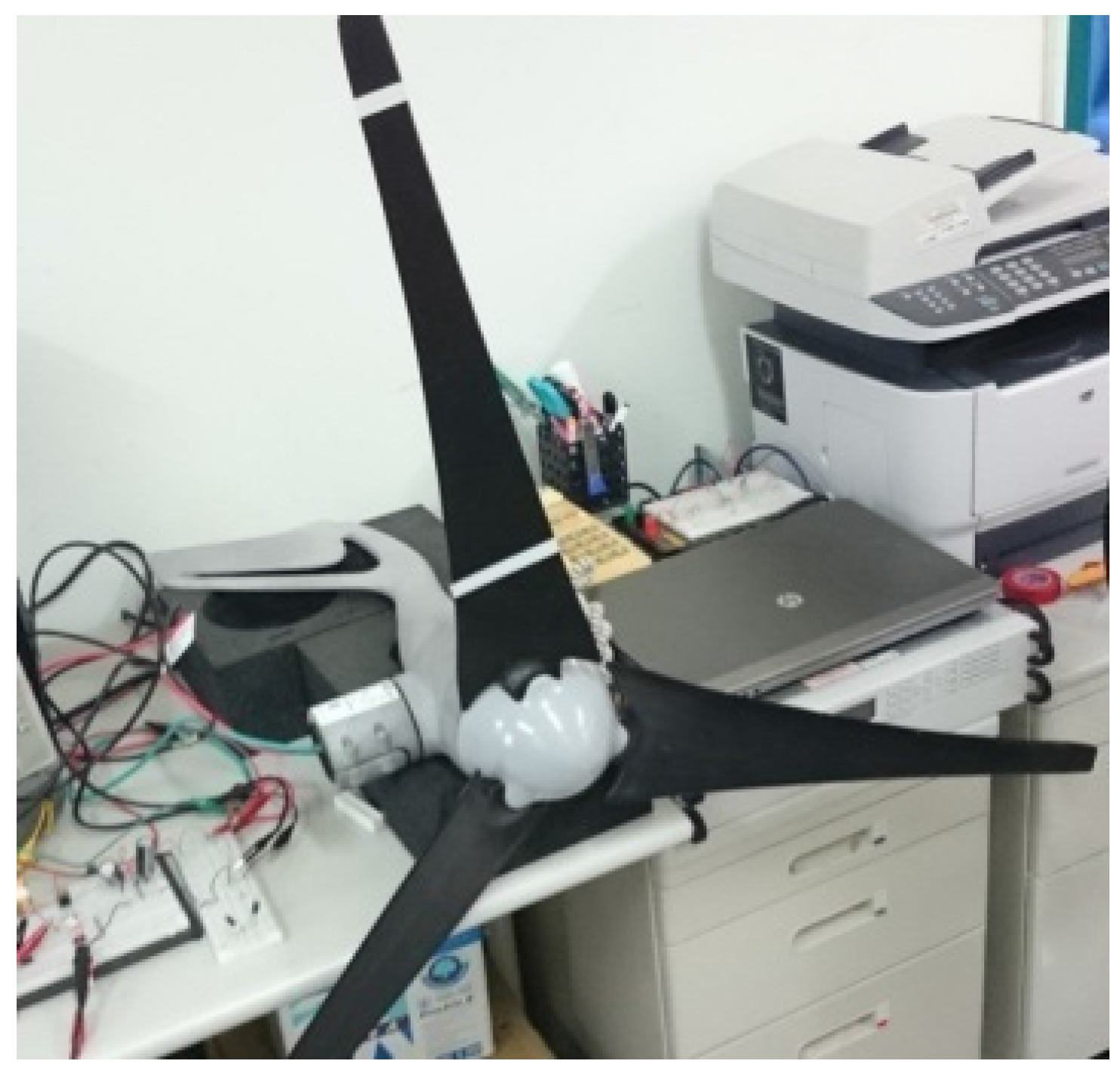 The wind turbine used in this study was an American Southwest Wind power AIR X series unit as shown in Figure 1. The output voltage is 48 VDC; rated power 160 W; rated wind speed 12.5 m/s; and start wind speed 3.58 m/s. The interior generator is a permanent magnet synchronous device. A King Fan Involute industrial fan unit was used to drive the wind turbine. The speed and strength of the wind could be adjusted by changing the speed and distance of the fan from the wind turbine blades.