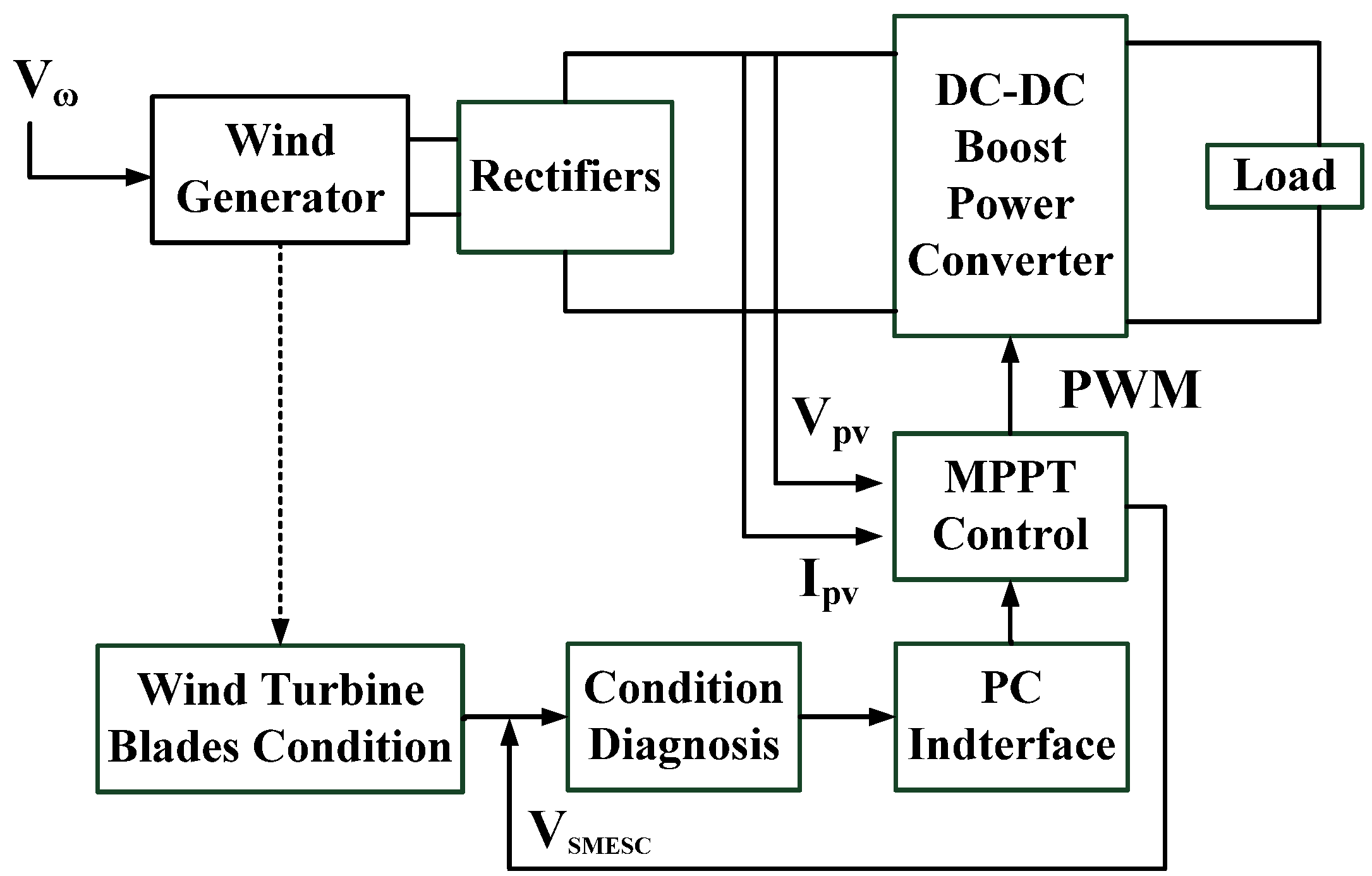 The rest of this study is organized as follows. In Section 2, the system circuit architecture and controller design is described; the system status signal analysis and fault diagnosis architecture are presented in Section 3. The maximum power point tracking simulation analysis and experimental results are shown Section 4. The results of wind turbine blade failure diagnosis experiments are demonstrated in Section 5. Conclusions are drawn in Section 6.