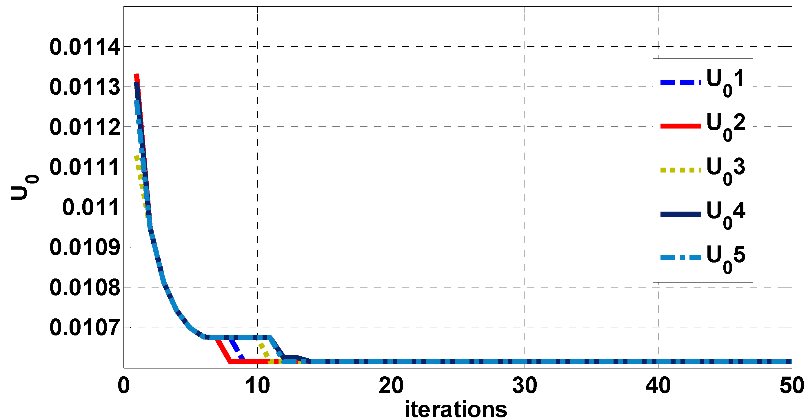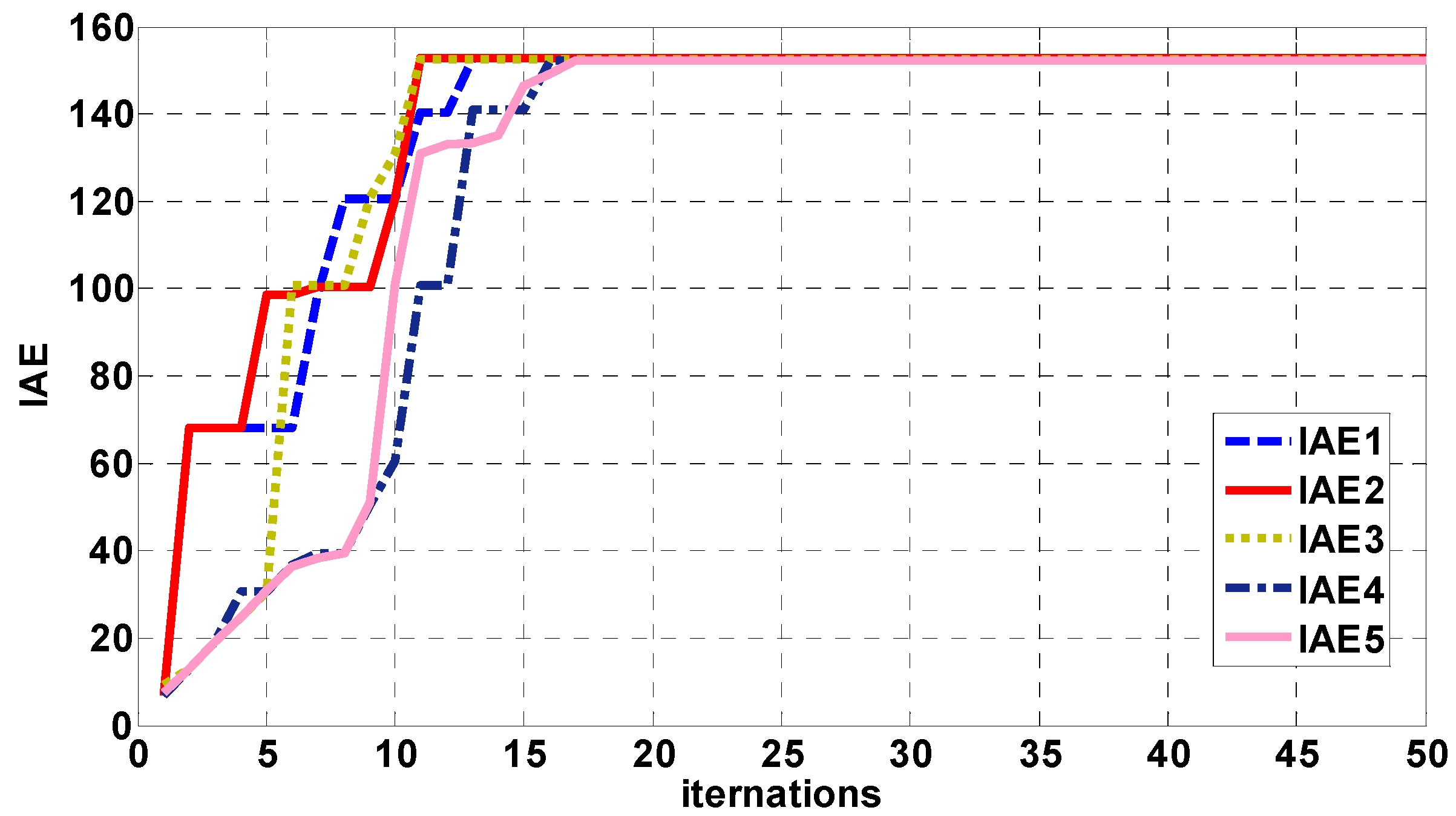 The most commonly used algorithm generally employs an empirical constant to control parameter . However, in this study a Chaos Embedded particle swarm optimization algorithm using mathematical iteration and improved by Logistic Maps, was used to determine the optimal control parameters (SMESC) and to define the objective function. Use was also made of a PSO algorithm to find the best control parameter to both minimize the objective function and reduce the number of mathematical iterations [33,34]. MATLAB R2010a was used to write the convergence curves of the system. The obtained was about 0.01 and the IAE optimum value was about 150, as shown in the convergence curves in Figure 3 and Figure 4. Each calculation was carried out five times.