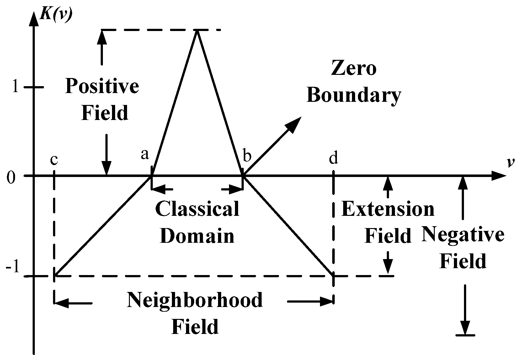Extenics Engineering Diagnosis can eliminate the need for much repetitive work and can resolve conflicts and compatibility problems. In classical mathematics, set 0, 1 is used to describe the characteristics of things. The fuzzy set is also based on (0, 1) to indicate the degree of fuzzy characteristics of things and extension of the set expands the scope of the fuzzy sets to (−, +). A Correlation function schematic diagram is shown in Figure 5 and correlation calculation formulae are shown below, Equations (2) and (3), for details about Extenics engineering applications readers may refer to reference [36]: