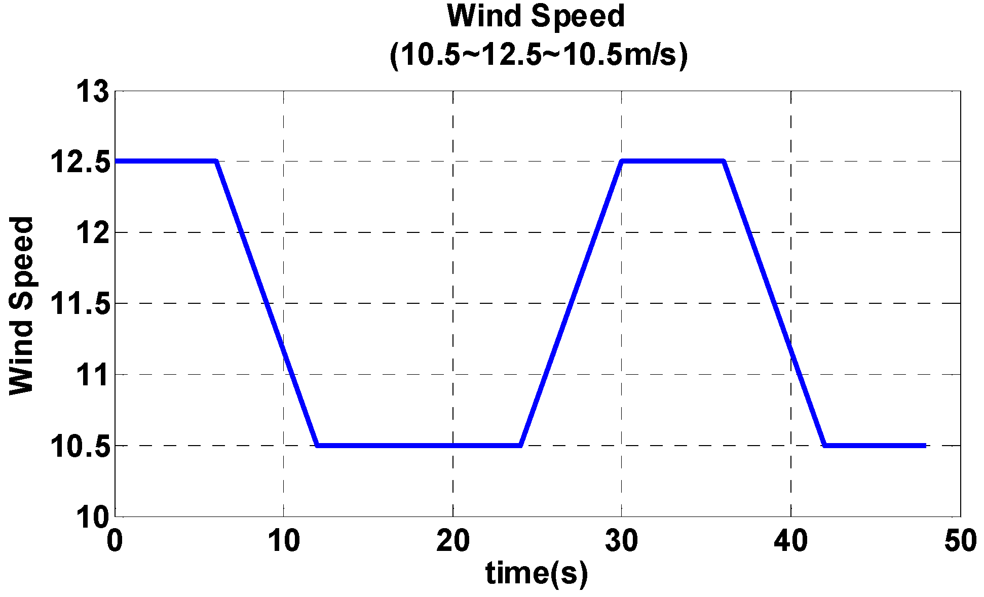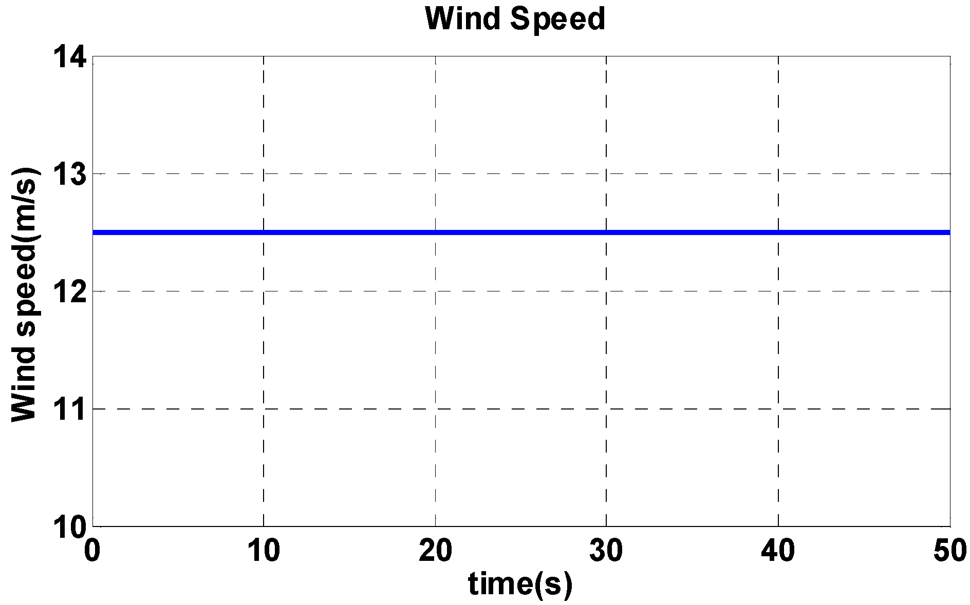 Two sets of wind speed states were simulated. In Figure 8 the wind speed shown is steady at 12.5 m/s. In Figure 9 the wind speed changes from 12.5 to 10.5 m/s after 10 s and then is further increased to 12.5 m/s and dropped again later. Changes in wind speed were tracked for 50 s.