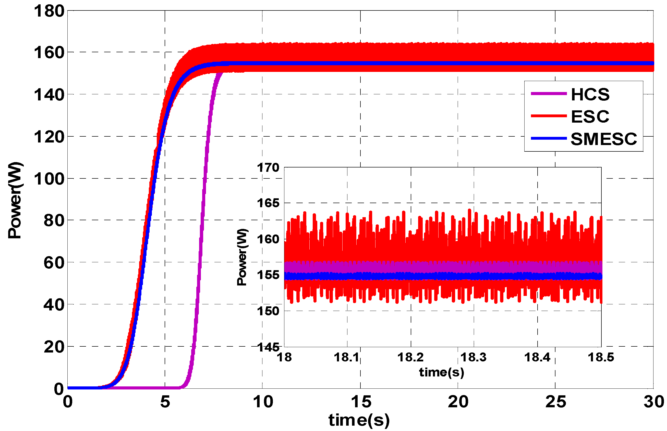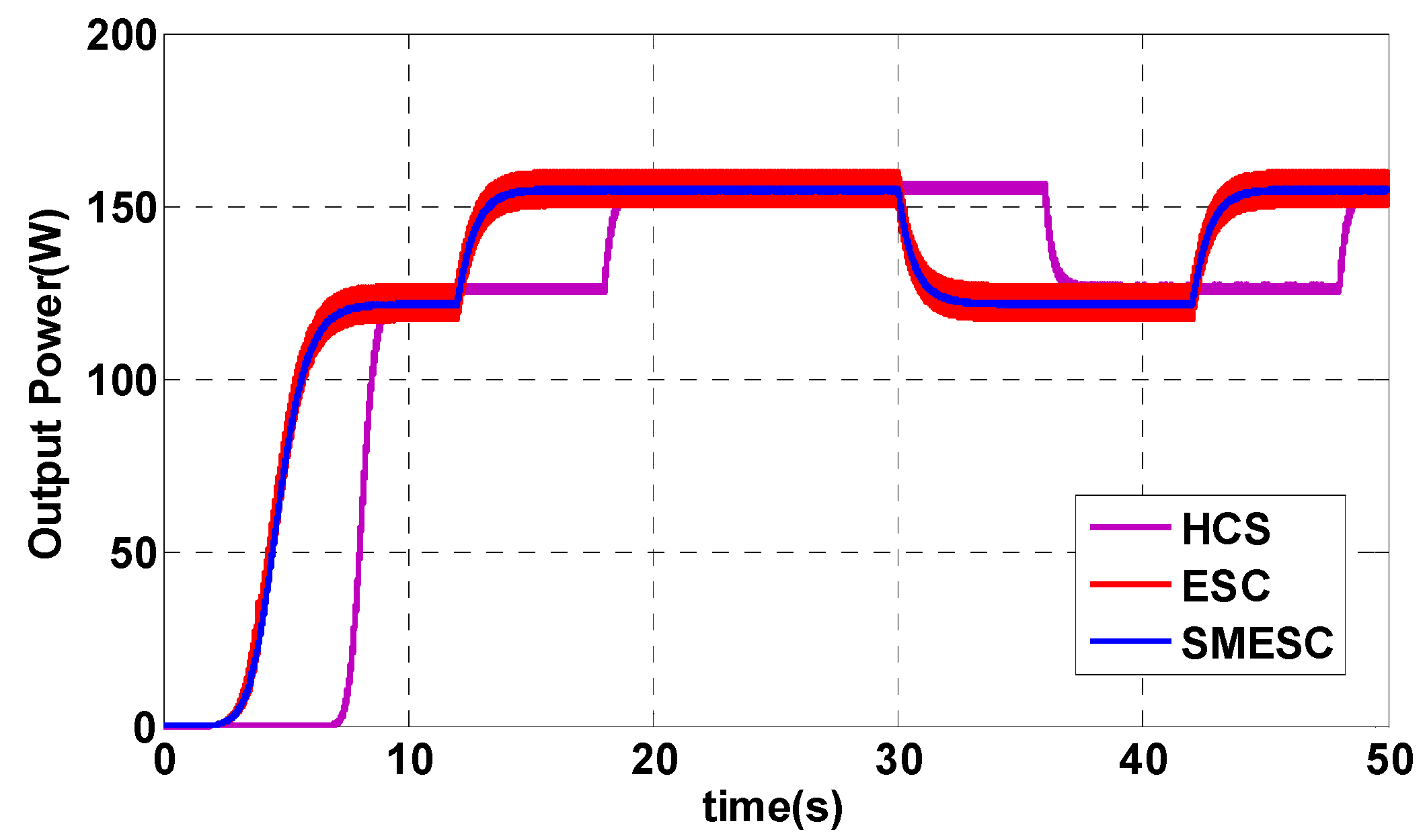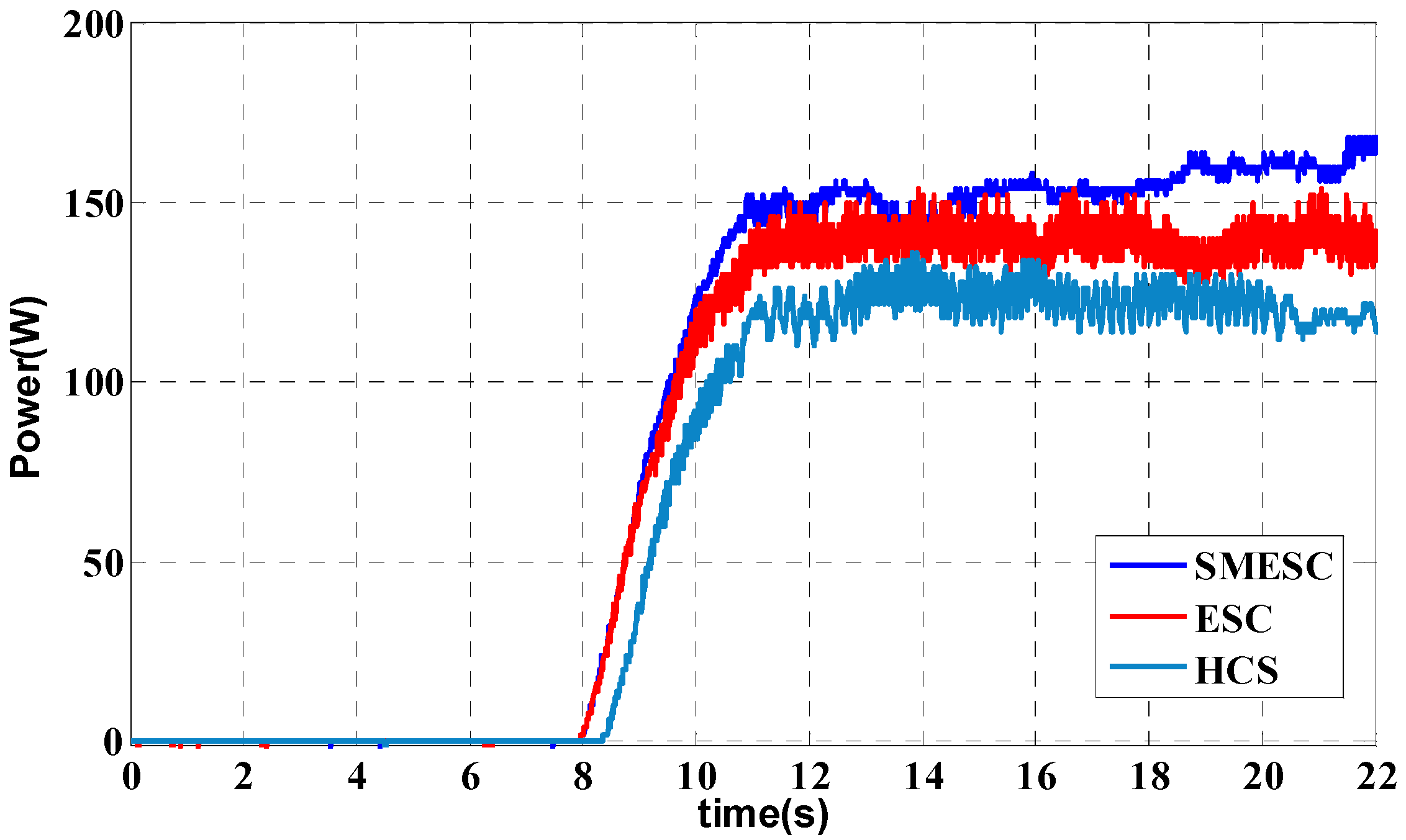 Finally, the measured output waveform and the dynamic response of three maximum power point tracking algorithms, under fixed wind speed, are compared (see Figure 18). It can be clearly seen that SMESC has the best response under both fluctuating and steady states. All three algorithms entered a fixed wind speed condition at 8 s. HCS has a better steady-state response than ESC, but the algorithm needs to measure one more speed signal and this leads to slower tracking. Although the maximum power point tracking speed of ESC is high, it is affected by dramatic high-frequency oscillation in the steady state. However, the join concept of the sliding layer makes the tracking speed of SMESC faster than that of the other two and the steady-state waveform is also more stable. Simulation analysis and real testing of the dynamic response under changing wind speed input shows SMESC to have the best output waveform.