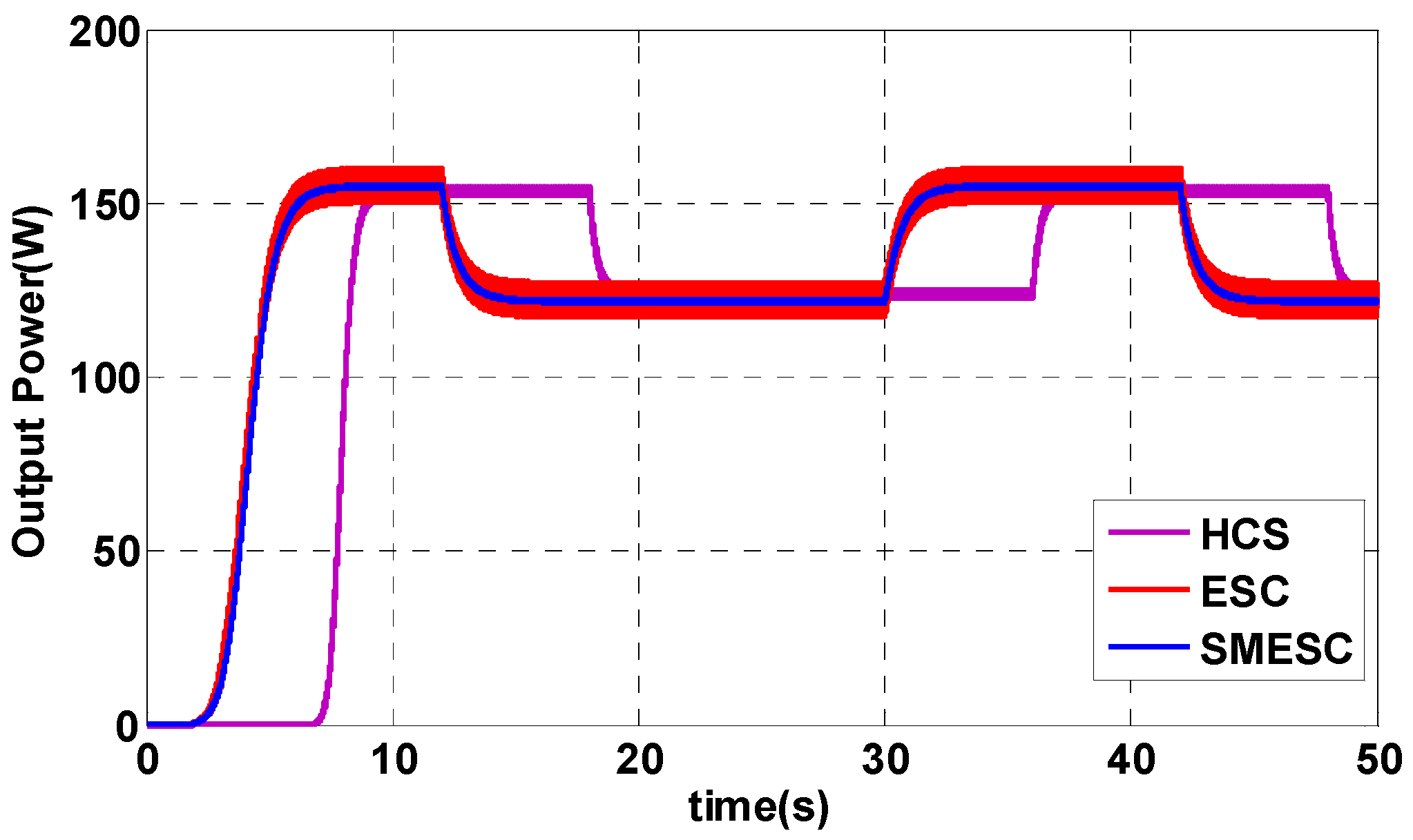 As can be seen in Figure 10, tracking times can be compared by observation of the transient state ESC for a longer time than the other two control methods. The dynamic response of HCS and SMESC are similar, but after the steady state, the HCS response is poorer than that of SMESC. From the figure it can be clearly observed that the steady-state oscillations of SMESC are smaller than for the other two control modes. The experimental results from our simulations show that under identical wind speed conditions the SMESC algorithm used here has a better dynamic response than the others.
