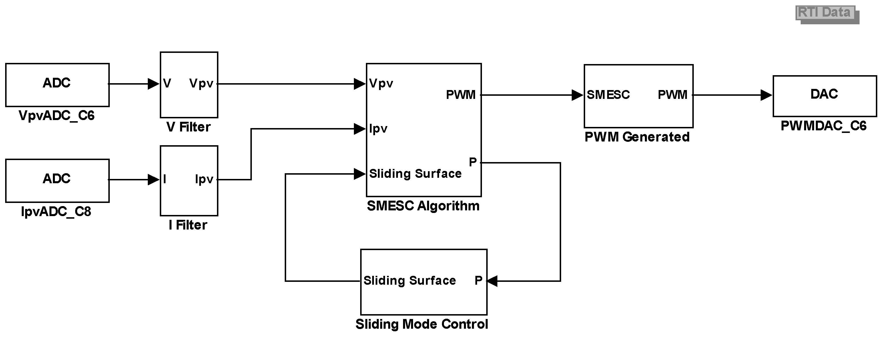 Software simulation was used to verify the feasibility of each of the control algorithms. The results of these simulations were used to establish a set of wind power generation procedures for actual wind maximum power point tracking, see the hardware flow chart Figure 13. To test a real machine the dSPACE controller utilizes the real-time library Matlab R2010a to realize various control algorithms. The simulation results clearly verify both power output stability and accuracy under conditions of steady and varying wind speed. Figure 14 is a block diagram of the Sliding Mode Extremum Seeking Control algorithm (SMESC) which has input and output from the Sliding Mode control.