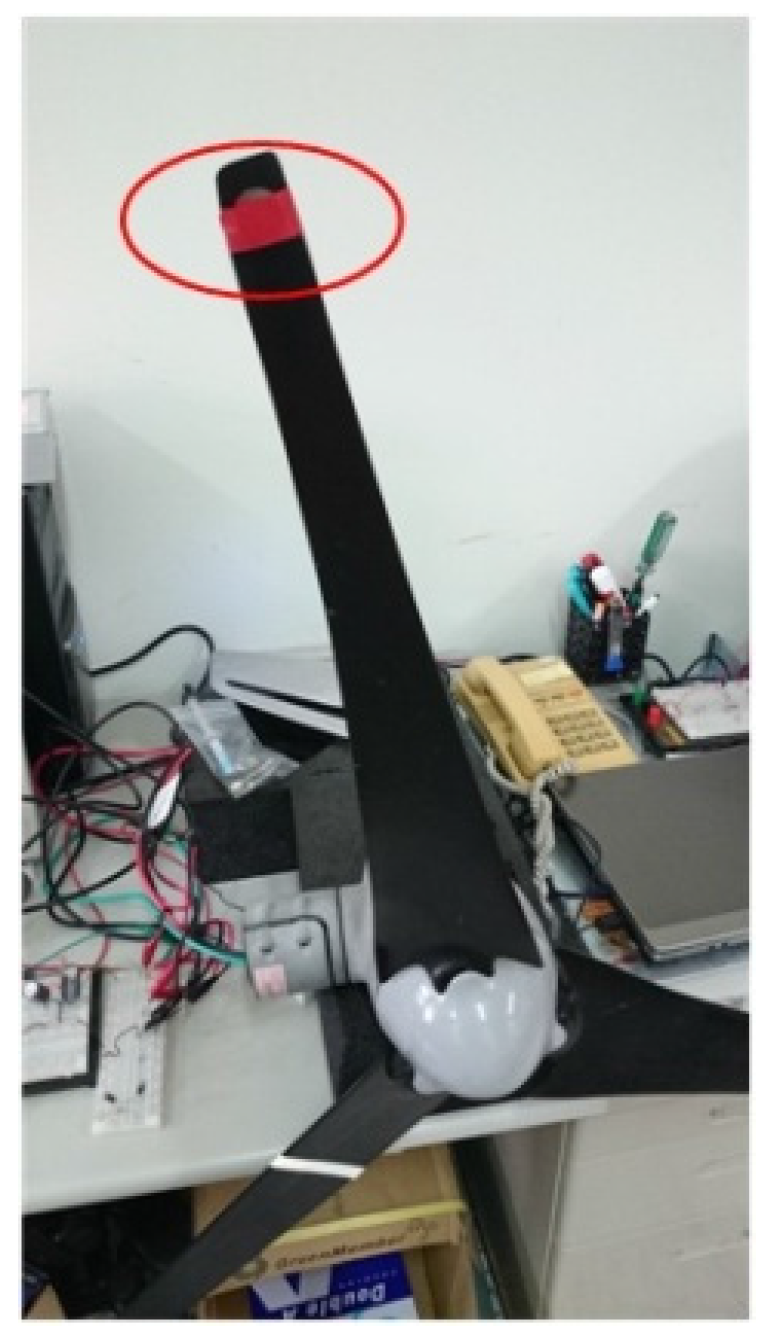 To simulate faults and carry out practical fault diagnosis on the AIR X wind turbine blades, various means were employed. Blocks were attached to the blades to cause imbalance and in some cases screws were loosened to cause instability and vibration, see Figure 23. This last fault condition will cause slightly abnormal output voltage. Figure 24 shows a block attached near the tip of a blade. This simulates sea salt crystallization or a bird hit and the loss of balance will result in abnormal output voltage. Figure 25 shows a mass hanging near the tip of a blade to simulate the attachment of wind-borne garbage to the blade. The loss of balance in all such cases, will result in uneven centripetal force, and will be reflected in changes and fluctuations of output voltage.