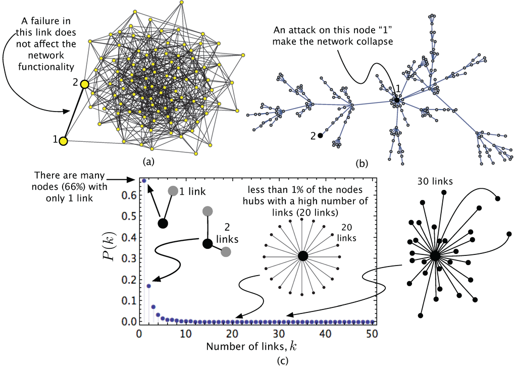 - For illustrative purposes, Figure 1c shows the probability density function of a scale-free network we have generated. Note that there are many nodes with few links, for instance, about 66% of nodes have only 1 link. However, there is a extremely low number of nodes with many links (“hubs”). It is more likely that a random failure affects one node with very few nodes (such as “2” in Figure 1b), which minimally impacts on the operation of the network as a whole. However a targeted attack on a hub (node “1” in Figure 1b) may disconnect the network in many parts, affecting severely its operation. This exemplifies the fact that scale-free networks are robust to random failures at most of their constituent nodes, but fragile when undergoing targeted attacks on a single or few hubs [121]. In contrast, Figure 1a is intuitively more robust, as mentioned before. This is the “random” or “Erdős-Rényi” (ER) network.