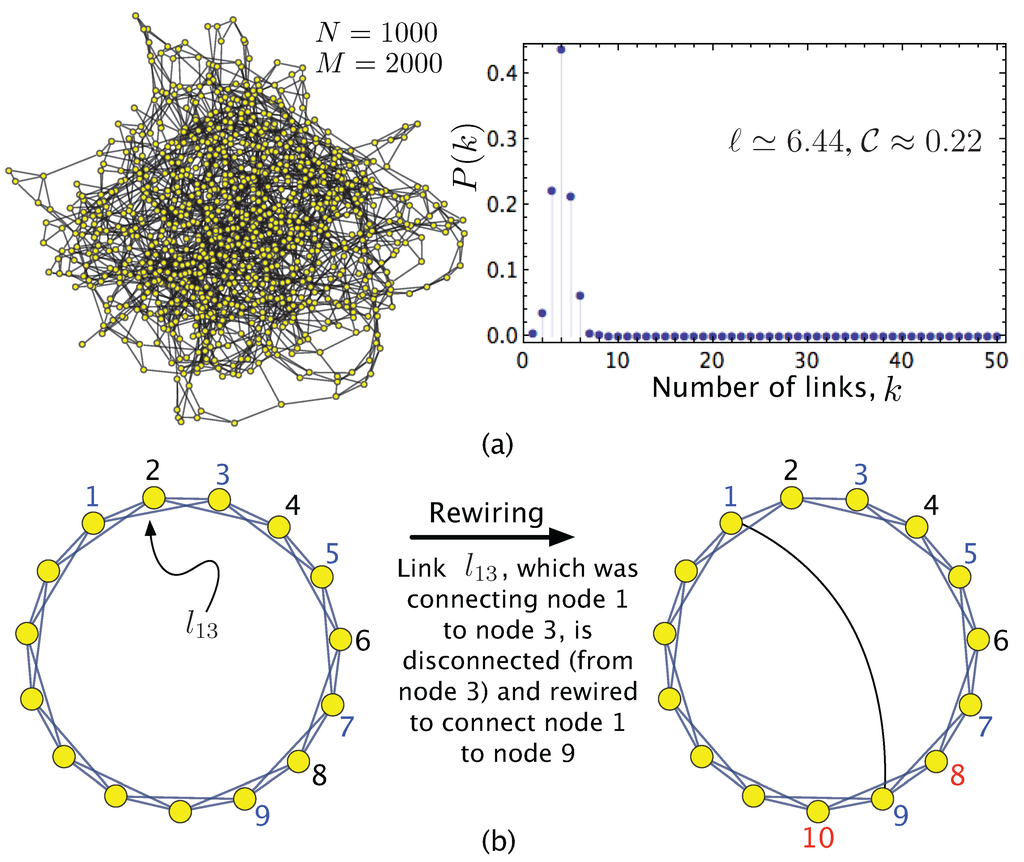 - A key feature of a small-world network is that it can be generated by taking a small fraction of the links in a regular (ordered) network and “rewiring” them. The rewiring algorithm involves going through each link and, with “rewiring probability” p, disconnecting one end of that link and connecting it to a new node chosen at random, with the only restrictions that no double edges or self-edges are ever generated [61]. Figure 2b aims at illustrating this procedure: link , which was connecting node 1 to node 3, is now disconnected (from node 3) and rewired to connect node 1 to node 9. This means that, in the new network, going from node 1 to node 9 only requires one jump via the rewired link (and thus ). However, in the original regular network, going from node 1 to node 9 through the geodesic or shortest path () involves 4 links (). That is, the rewired link can be viewed as a “shortcut” between nodes 1 and 9, which avoids having to go through intermediate nodes. In general, creating a few shortcuts may have the effect of reducing at a great extent the mean free path [124].