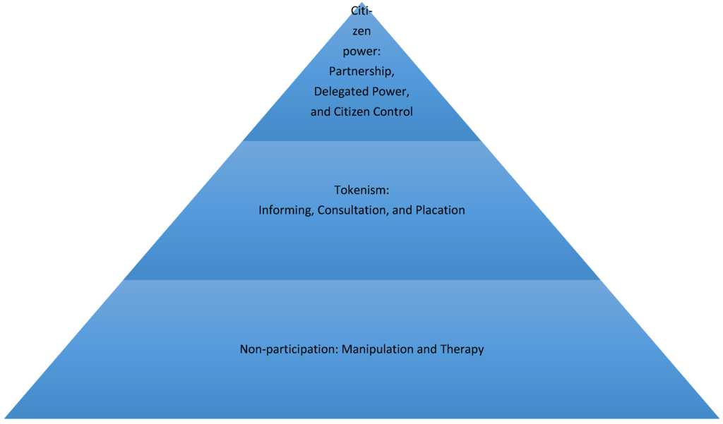 Existing evidence suggests that the middle level of Arnstein’s ladder is the most frequent level of stakeholders’ participation in developed economies. However, only consultation, involvement, or collaboration with stakeholders occurs at this level. This does not equate to full participation, but rather suggests tokenism as stakeholders cannot influence decisions.