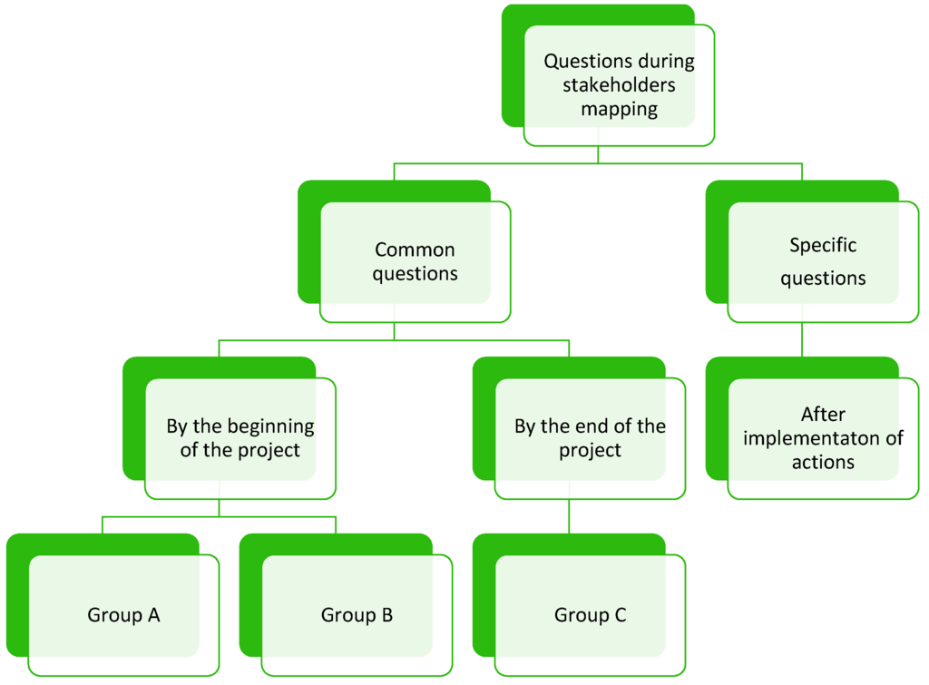 There are two types of questions related to data collection and stakeholder mapping. The first type relates to all pilots and is therefore called “common to all pilots” questions. The second type relates only to specific actions within certain pilot projects and workshops with local governments (Figure 2). The protocol for data collection is described in Komendantova et al. [58].