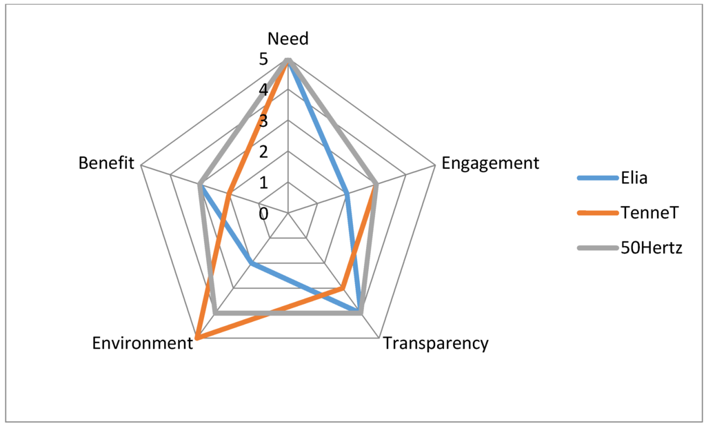Regarding the guiding principle “transparency,” it seems that it is not only connected with the availability of information and its clarity but also with the level of trust in the source of this information. This result also corresponds to the available evidence. When researching public opposition to new energy infrastructure, Devine-Wright (2012) investigated the role of place attachments as well as the project-related constructs such as perceived impacts, trust, and procedural justice [23]. Based on surveys from inhabitants in southwest England, he found that perceptions of positive and negative impacts of the project, followed by trust in developer and procedural justice, are identified as major factors influencing public opposition. Cotton and Devine-Wright (2011) studied the discourse among stakeholders and the local community in response to a new power line [63]. They revealed three discourses about procedures for public participation, trust in the transmission system operators, and the need for the project in light of the possibility of centralized or decentralized energy generation. In a comparative study on public beliefs about high-voltage power lines in Norway, Sweden, and the United Kingdom, Aas et al. (2014) used correlation analysis to reveal that the strongest correlation is between acceptance or support of the project and trust in TSO’s activities [64]. Trust, therefore, seems to be one of the major factors influencing social support.