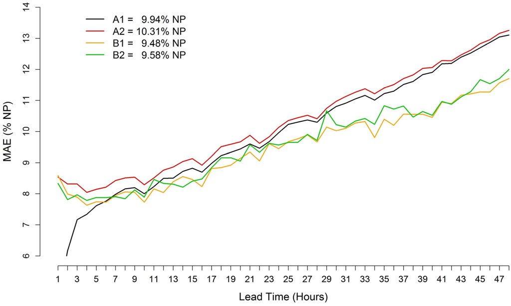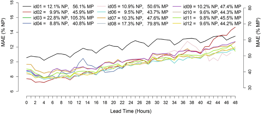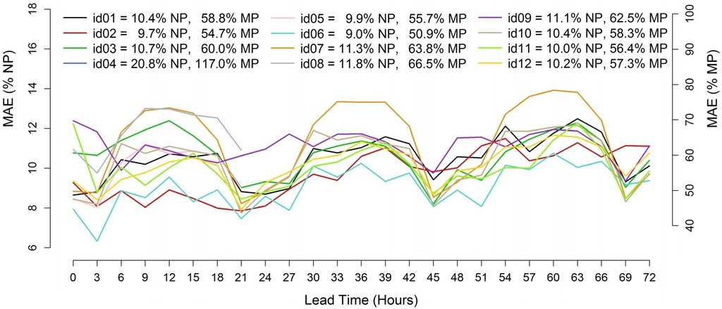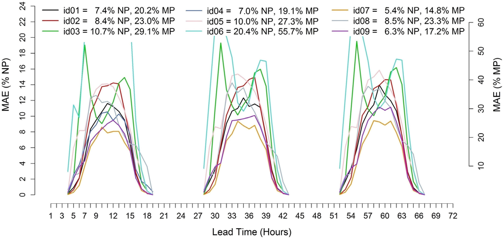 Except for a clear outlier, similar MAE trends are observed, with slightly higher errors for larger lead times. There is, however, a significant difference between the lowest and the highest MAE, which span in about 4 or 5 MAE/NP percentage points, depending on the lead time. Almost all the models show a strong daily cycle with larger MAE values during evening and night hours. Looking at the MAE/MP values, it can be noticed that most of the forecasts range between 50% and 65%, depending on the forecast horizon. The best result is achieved by id06 with a total MAE/NP of 9.0% and a MAE/MP of 50.9%. The DM test applied comparing id06 to the second best (id02, 9.7% MAE/NP and 54.7% MAE/MP) returns a p-value of 3.91 × 10−6, allowing rejection of the hypothesis that the forecasts have the same accuracy.