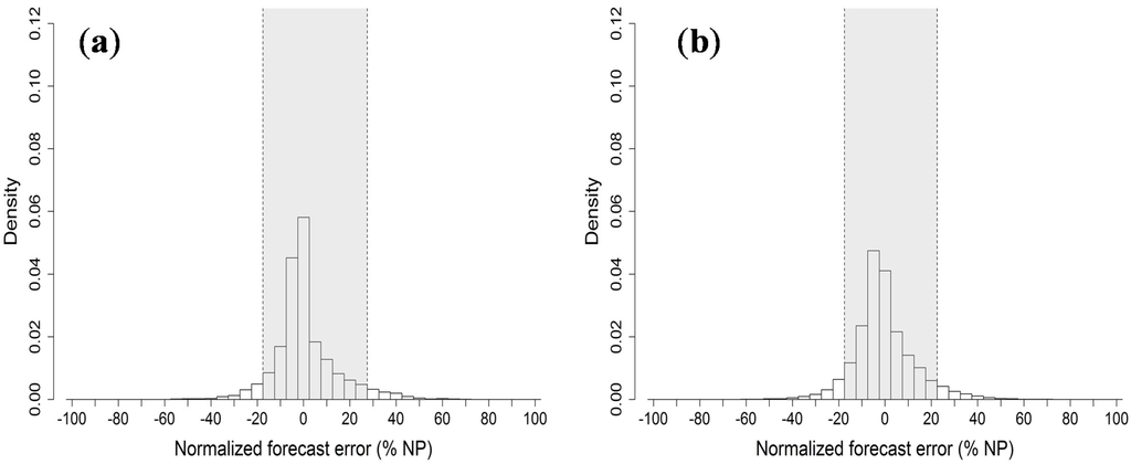 Error distributions obtained by id07 are investigated using the diagrams shown in Figure 9. Comparing the two histograms with those calculated on wind power, sharper and narrower distributions for both the Milano and Catania tests are seen, which implies a higher level of predictability of solar power in this exercise. Catania, in particular, shows a pretty symmetric distribution, with forecast errors being lower than 7.5% of NP 83% of the time. The distribution obtained for Milano is less symmetric and shows a higher number of negative errors. For Milano, errors lower than 7.5% are observed in 72% of the cases.