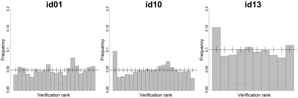 The different number of bins reflects the number of quantiles computed by the models: id13 delivered a wind power distribution made of 9 quantiles, while the other two participants used 19 quantiles. The vertical bars shown in the diagrams are calculated with a quantile function for a binomial distribution, in order to show a range in which deviations from the perfectly uniform distribution are still consistent with reliability. Deviations are in fact possible, since the number of samples in each bin is limited. The bars delimit the 5%–95% quantiles of the binomial distribution.