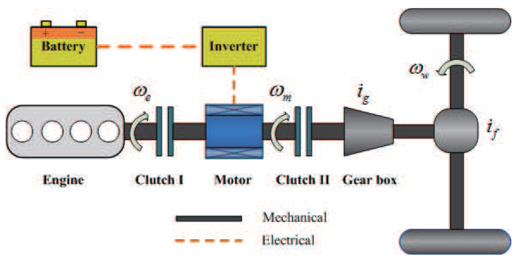 Different from the architectures of the Chevrolet Volt [2] and Toyota Prius [3], in which planetary gear sets are used, in this study, the architecture of a plug-in parallel HEV with a five-speed gearbox is considered and illustrated in Figure 1. As can be seen, this HEV system includes two power sources: internal combustion engine (ICE) and electric machine (EM). The ICE is connected to the EM shaft through Clutch I; the EM is connected to real wheels through Clutch II and the five-speed gearbox. The parallel HEV system mainly works under the one of following three modes: (1) EV mode, when only Clutch II is engaged; (2) battery recover (BR) mode, when only Clutch I is engaged; and (3) HEV mode, when Clutches I and II are engaged and the engine and motor work together. Specifically, the EM integrates the starter, generator and motor; energy regeneration is available for this architecture.