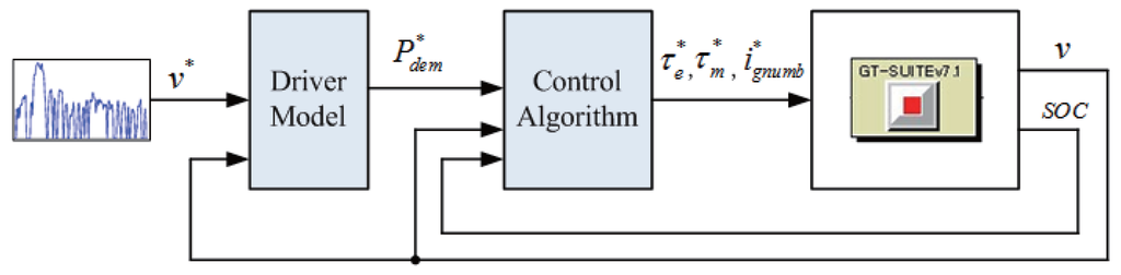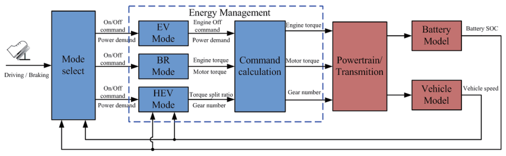 Figure 2 gives the schematic diagram of the vehicle control system. As shown in this figure, the control system of the PHEV consists of two major parts, the mode select block and the energy management block. The inputs of the mode select block are the driver’s intention (i.e., driving or braking) and the vehicle states ( i.e., the vehicle speed and the battery SOC). The outputs of the mode select block are the mode switching commands and the instant power demand, which interprets the driver’s accelerator or brake pedal position. Depending on these outputs, one of three different modes, i.e., EV mode, BR mode and HEV mode, is activated. The energy management block then outputs corresponding commands of the engine torque, motor torque and gear number to the powertrain and transmission. In the mode select part, the conditions for selecting different modes can be briefly explained as follows: If the battery SOC is below the maximum level and the vehicle is braking or the battery SOC is beyond the minimum level and the vehicle is starting, the EV mode is selected. If the SOC is too low, the mode select block will activates the BR mode. For normal driving circumstances, the HEV mode will be utilized.