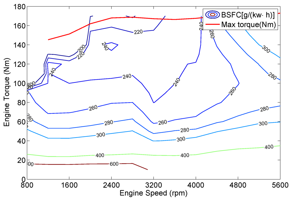 The ICE model is developed by focusing on the characteristics of fuel consumption and torque output. Ignoring the transient dynamics of the engine, the quasi-static model is introduced to the gasoline engine [35]. The fuel consumption of the engine can be calculated by using the engine efficiency extracted from the break specific fuel consumption (BSFC) map (shown in Figure 4), and subsequently, the following equivalent function with respect to the speed and torque of engine is employed to approximate the fuel consumption characteristic of the ICE.