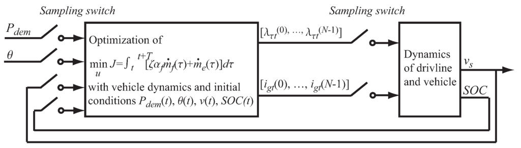 For the presented HEV system, it should be noted that at each sampling time, the decisions of and affect not only the current states of the powertrain, but also the transient profile of the state during a period since the systems of the vehicle and battery are a dynamical system. Moreover, at the current time, simply noted as , the decisions of and according to the current states (vehicle speed and demand power ) influence not only the fuel and electricity consumption at the time , which can be described by the fuel mass flow rate and the instantaneous change rate of the energy stored in battery , but also and , , where T defines a given finite time horizon. Since vehicle speed , is determined by the vehicle dynamics forced by the demand power . Therefore, for the decisions of and , the following function is introduced as the cost function.