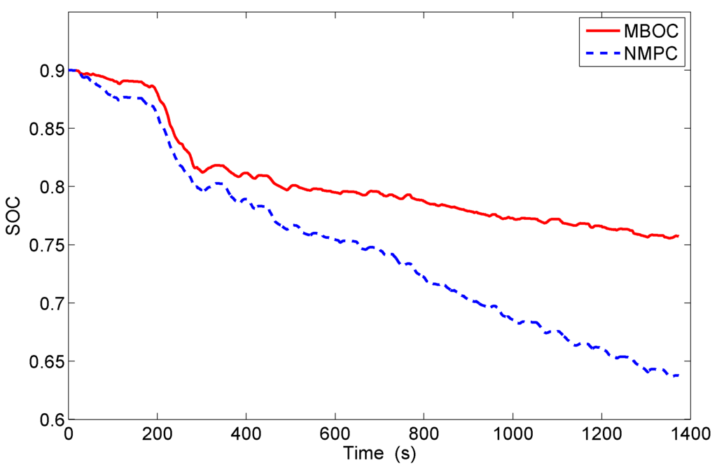 For different energy price ratios, a quantitative comparison on energy cost between these two control strategies is reported in Table 3. In this table, the positive sign in the term of improvement represents the reduction of the energy cost, and the negative sign represents the increase of that. From this table, it can be noted that the fuel cost by the MBOC strategy is increased by 16.9%, 11.5% and 11.2% compared to that by the NMPC strategy under energy price ratios of , and , respectively; the electricity costs are significantly decreased by 45.8%, 34.7% and 55.1% for the MBOC strategy over the NMPC strategy, respectively. Therefore, the total costs are accordingly saved by 6.5%, 7.7% and 17.0%, respectively. Although these two policies, as local optimization methods, both will obtain approximate optimal solutions, the improvement on the total cost indicates that the decision obtained by the MBOC method is more optimal than that obtained by the NMPC method. This is mainly because, on the one hand, the accuracy of the discrete model directly affects the accuracy of the decision in each time horizon, consequently influencing the energy consumption. For the MBOC strategy proposed in this study, the vehicle model is discretized by the discrete variational method; this discrete model is more accurate than the common discrete method used in NMPC under the same time step. On the other hand, as a real-time predictive method, the on-line NMPC is sensitive to transient disturbance and noise, which often leads to the overaction. However, the proposed offline MBOC is calmer when making the decision; the energy consumption thus is improved.
