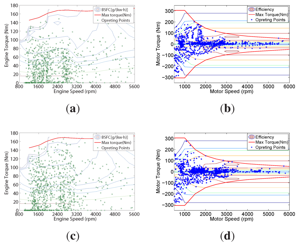 Figure 15 presents the operating points of the engine and motor for two energy price ratios of and . By comparing Figure 15a to Figure 15c, it can be found that more operating points of the engine, in rotation speed ranging from 1000 to 3000 rpm, distribute to the region where the BSFC value is lower than 260 g/kWh. It also can be noticed from Figure 15b,d that more operating points of the motor, in the same rotation speed range, concentrate on the region where the efficiency is larger than 85 percent. These phenomenon indicate that, for a low energy price ratio (i.e., fuel is relatively inexpensive compared to electricity), the proposed power management strategy makes the engine and motor work with high efficiency; therefore, the real energy consumption is significantly reduced, as reported in Table 4. However, from the viewpoint of economic cost, as is the concern of the current study, some expenditures have been saved under an inexpensive electricity price, even though this strategy forces the actuators to run with relatively low efficiency.