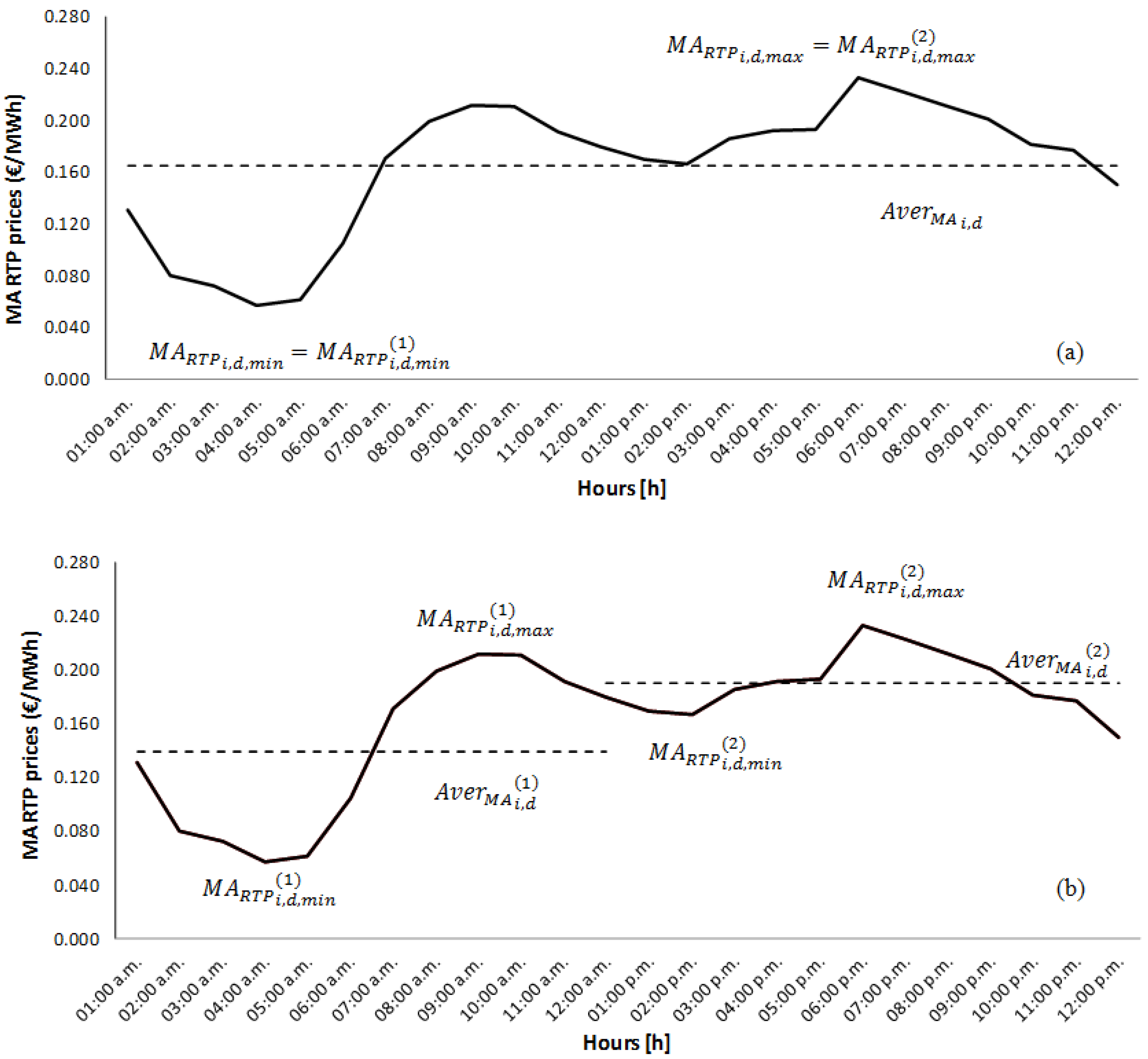 where is the daily average value of the MA RTP profile and is the semi-daily average value of the MA RTP profile (in the semi-daily period of the day , with ). Figure 3a,b also shows the min/max values of MA RTP profiles in the daily/semi-daily period: