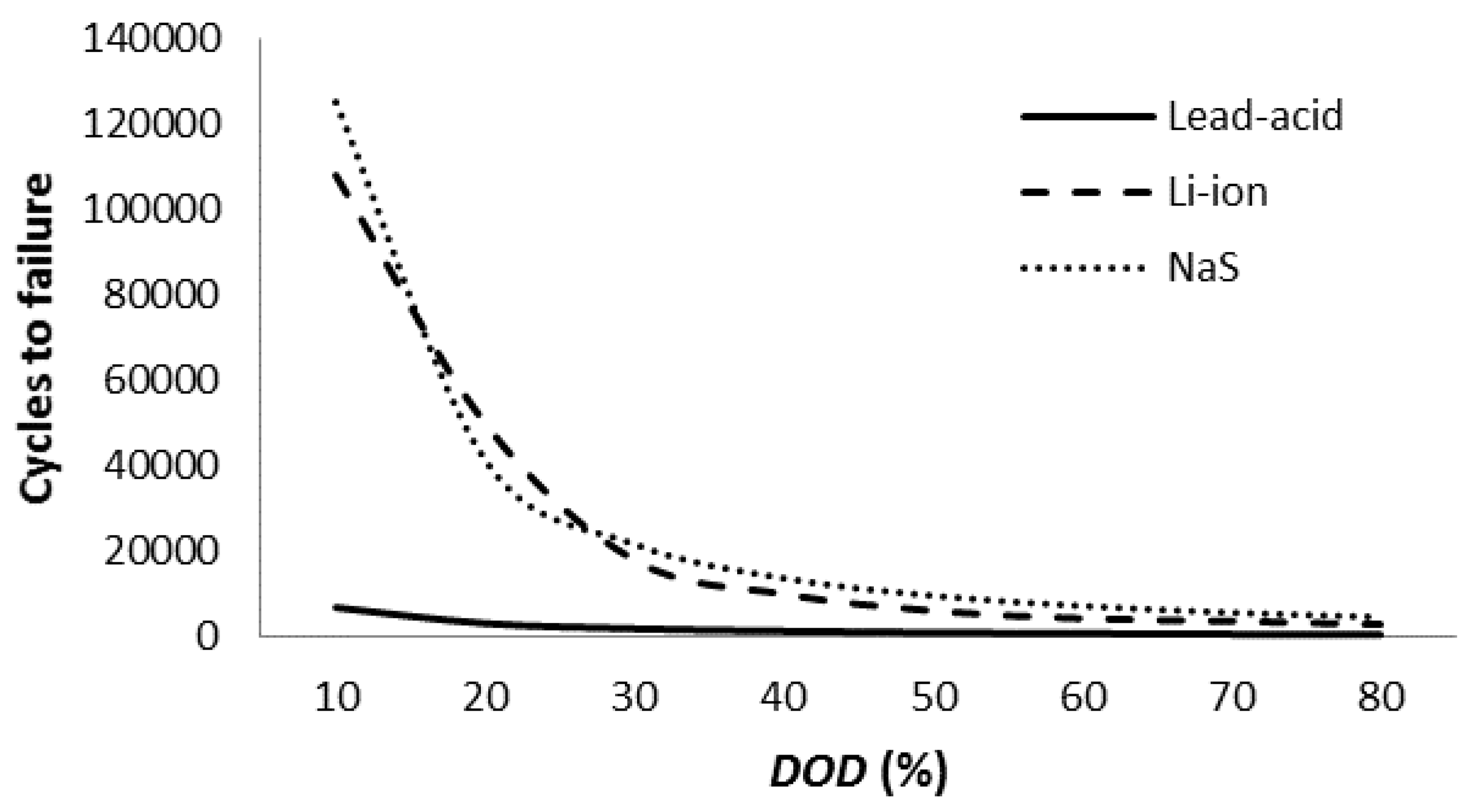 Cycles to failure vs. depth-of-discharge (DOD) curve for three different battery technologies.