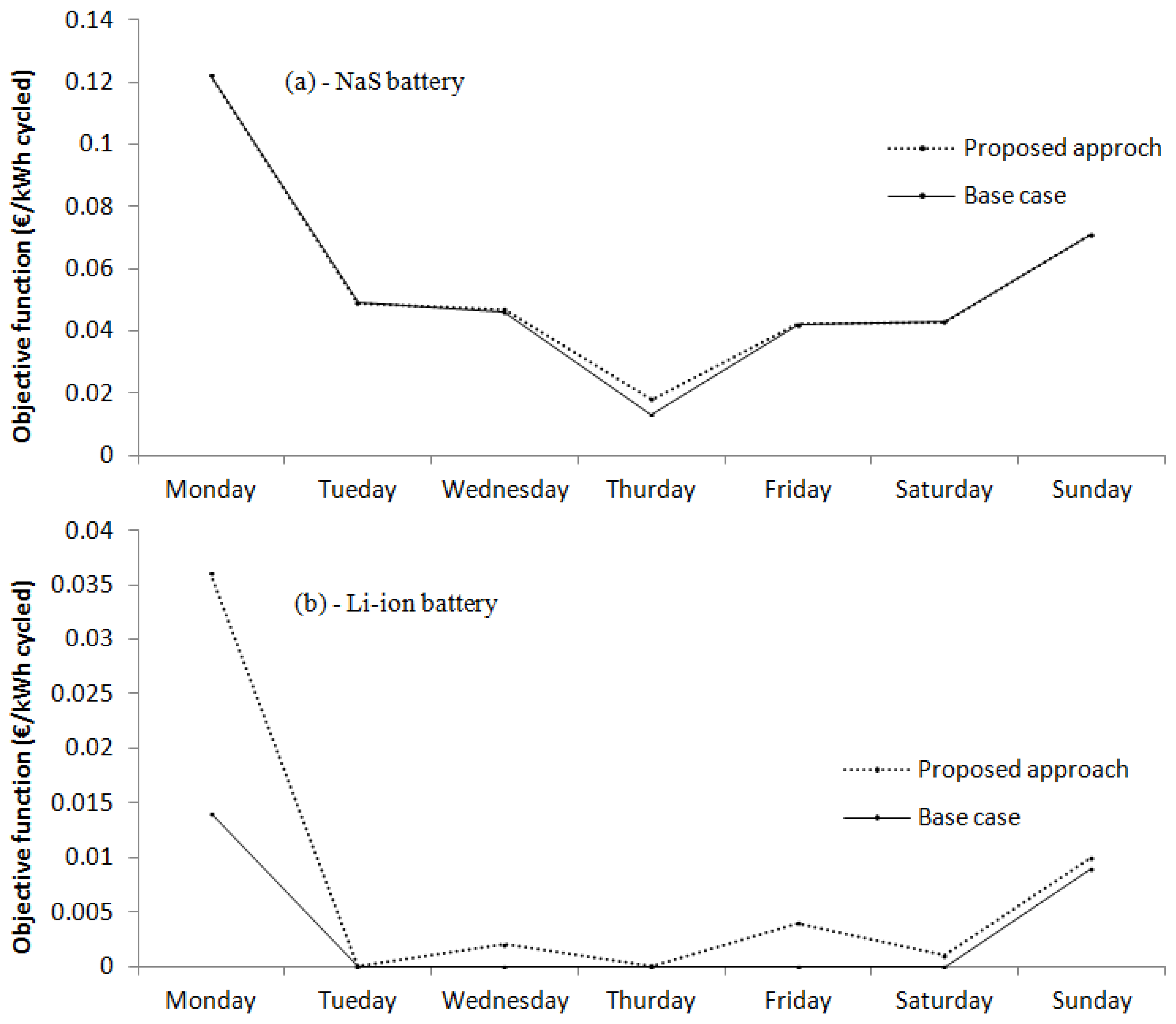 Graphic comparison between the objective function values of the two approaches: (a) NaS battery and (b) Li-ion battery.