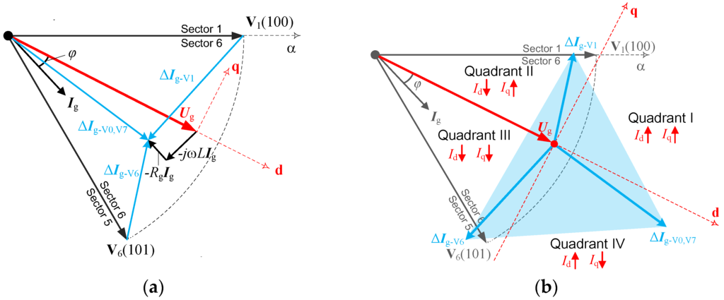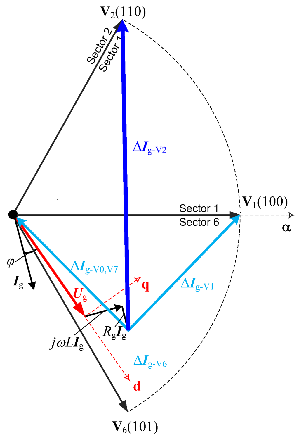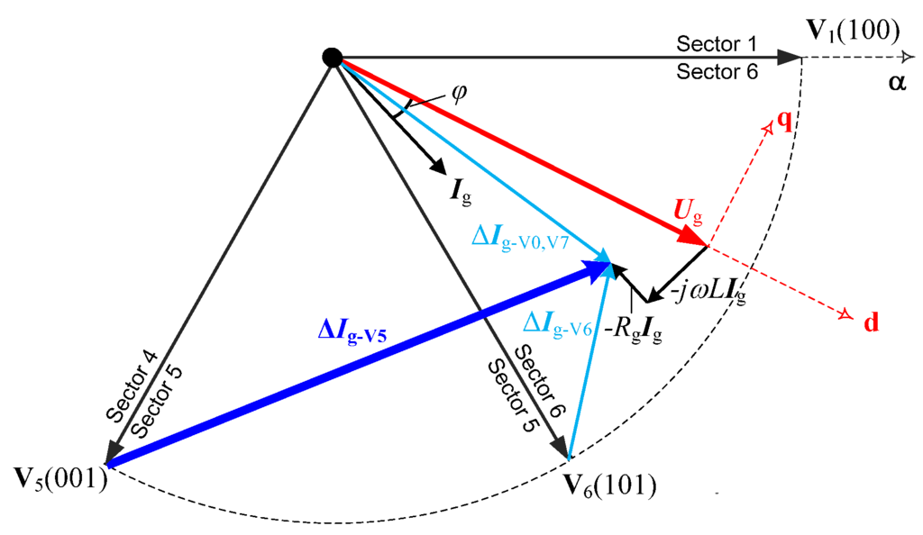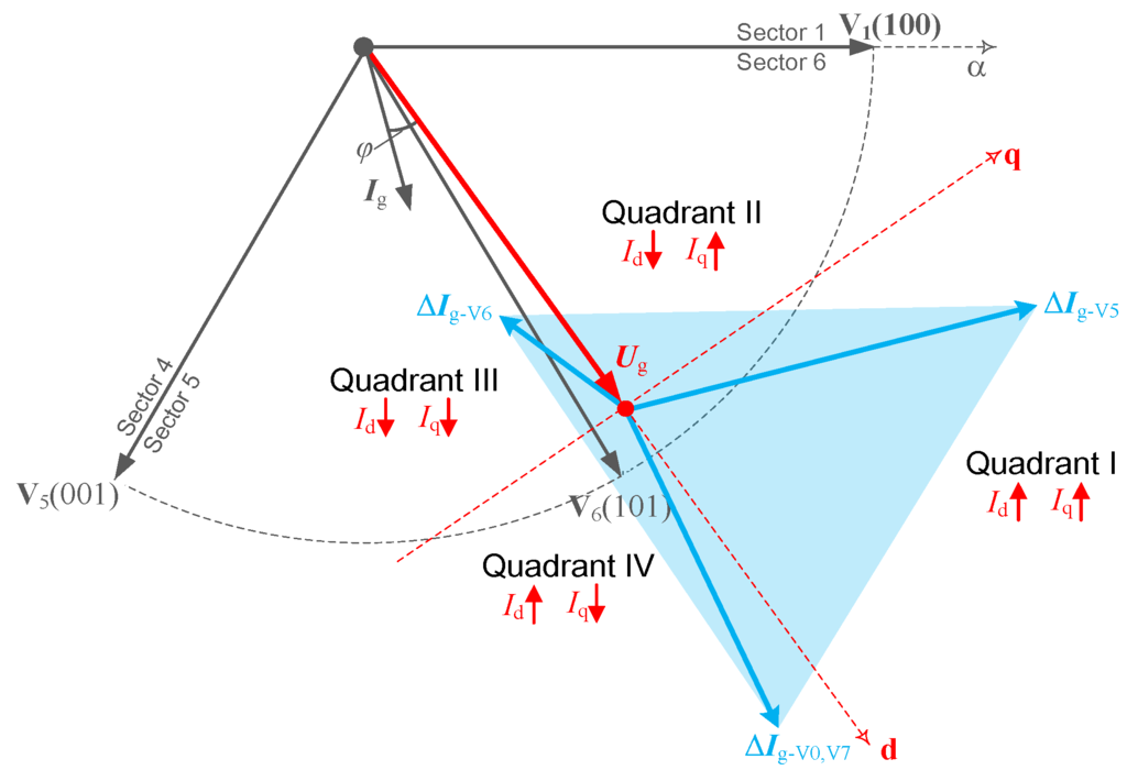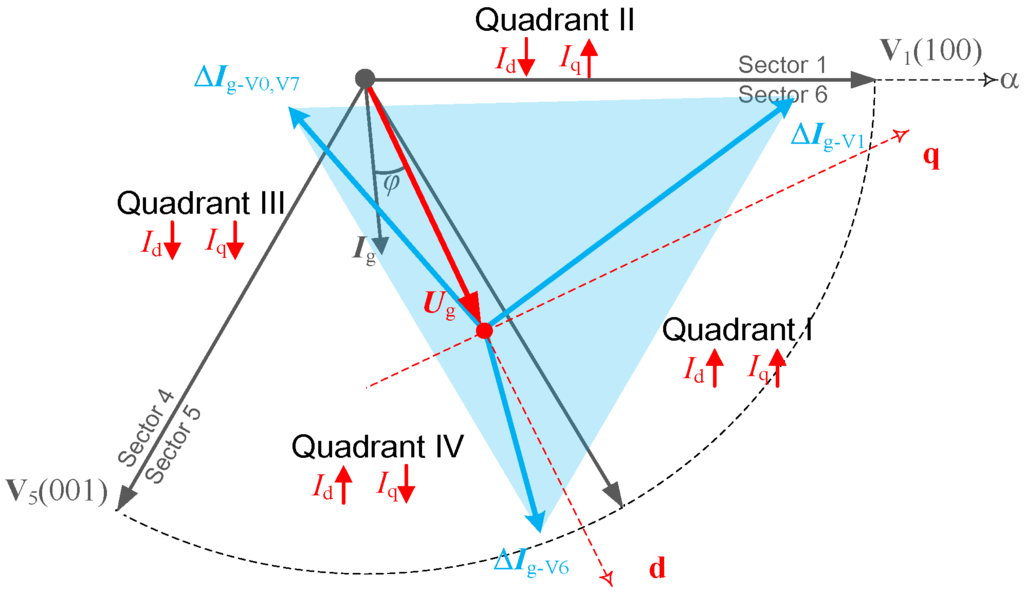 As shown in Figure 3, the light blue area composed of ΔIg-V5, ΔIg-V6, ΔIg-V0,V7 covers four quadrants in the dq-reference frame. Consequently, both an increase and a decrease of the dq-axes currents can be expected under the joint actions of V5, V6 and V0,7. Flexible regulation of currents can thus be achieved. Therefore, when Ug is located in the position as shown in Figure 3, V5 and V6 should be selected as active vectors, instead of V1 and V6. A similar conclusion can be easily obtained when Ug lies in other sectors.