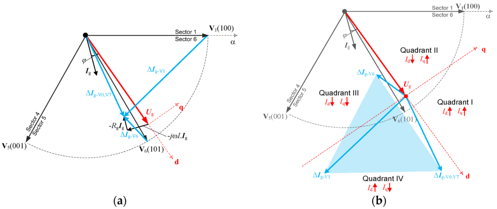 Within each sampling period Ts, the current variation ΔIg-Ts produced by the joint actions of two active vectors and the zero vector V0,7 can be predicted as: