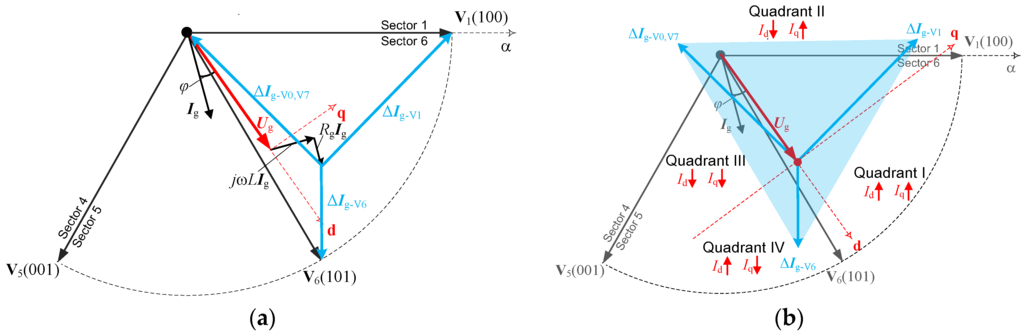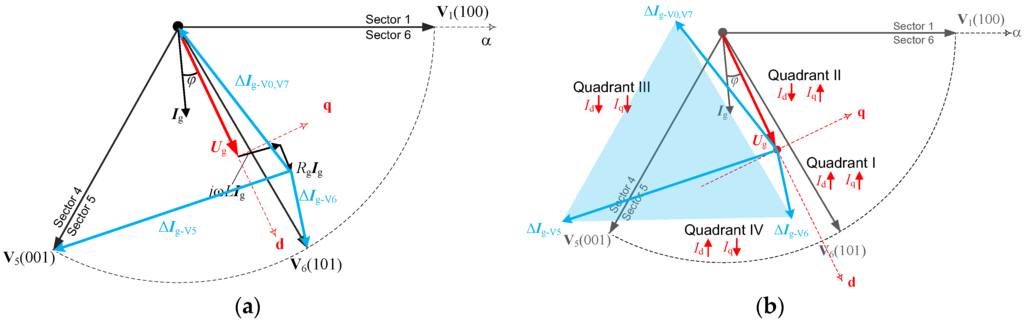Assuming that the three-phase grid-tied reversible converter is operating in rectifier mode, the instantaneous current variations caused by the application of V6, V1 and V0,7 when Ug lies in Sector 6 is depicted in Figure 1a. After vector movement and rearrangement, instantaneous current variations in the dq-reference frame can be depicted as in Figure 1b.