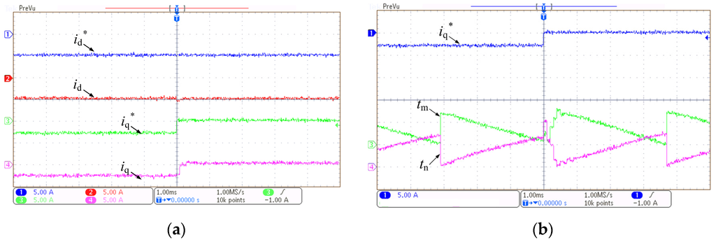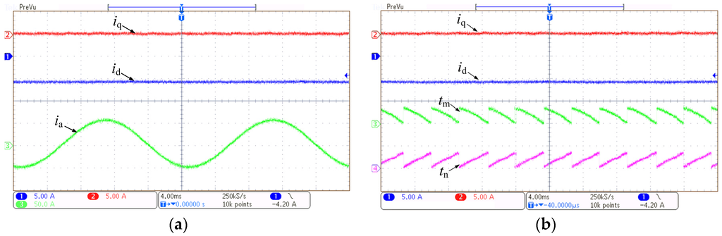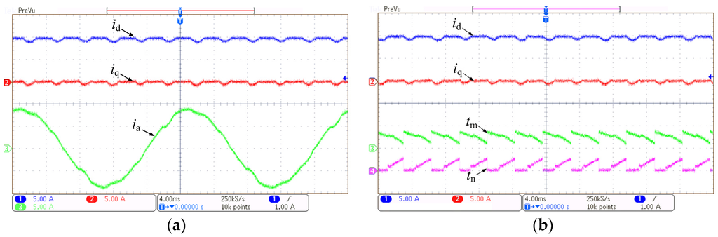 Experimental results: dq-axis currents and Phase A current (inverter mode, Method II, id* = 6 A, iq* = 0 A). (a) dq-axis and Phase A currents; (b) tm and tn (50 μs/division).