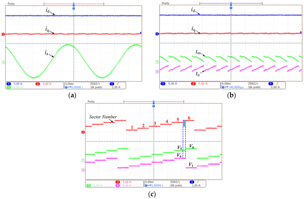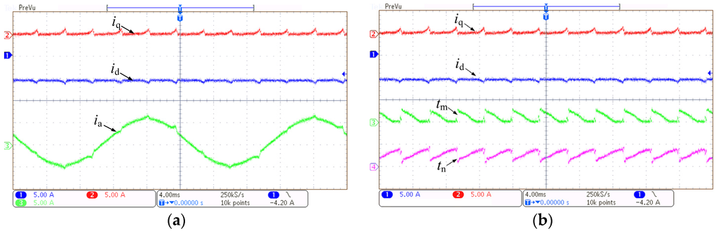 As argued in previous sections, the control failure and performance deterioration demonstrated in Figure 10 and Figure 11 result from the incorrect selection of voltage vectors. Those two voltage vectors, which are adjacent to the grid voltage vectors, are not always the optimum vectors. Figure 12 presents experimental waveforms when the proposed Method II is adopted and the converter is operating in rectifier mode. These experimental results were obtained under the same conditions as those of Figure 10. It can be seen that the proposed Method II presents superior performances to the conventional predictive control strategy. Due to the modified switching pattern shown in Figure 12c, both tm and tn stay positive at all times when the proposed strategy is used, as shown in Figure 12b. Periodic fluctuations in the dq-axes currents are successfully eliminated as expected, and as a result, dq-axes currents can both be regulated to be smooth and constant. The sinusoidal AC current is further obtained. Similar results can be obtained when the converter is operating in inverter mode, as shown in Figure 13.