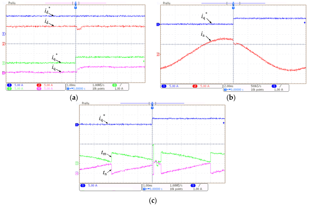 Experimental results: dq-axis currents and Phase A current with iq* step changed from 0 to 3 A (rectifier mode, Method I, id* = 9 A). (a) dq-axis currents; (b) Phase A current; (c) tm and tn (25 μs/division).