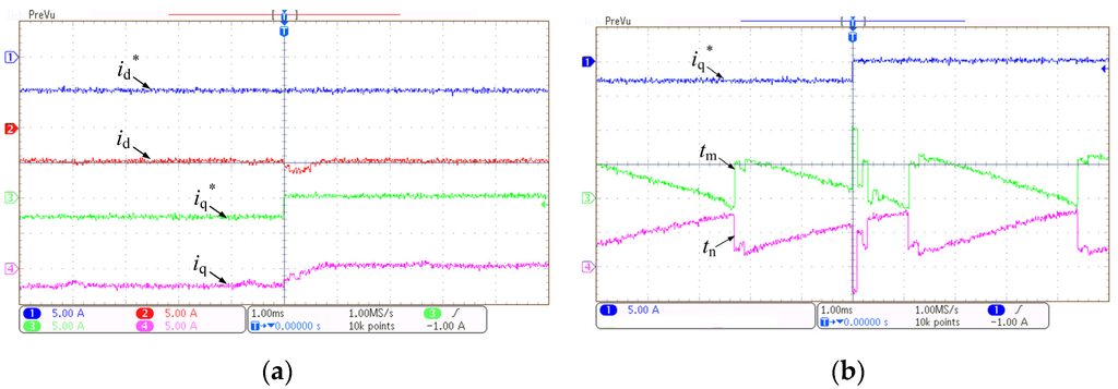 Experimental results: dq-axis currents and Phase A current with iq* step changed from 0 A to 3 A (inverter mode, Method I, id* = 0 A). (a) dq-axis currents; (b) tm and tn (25 μs/division).