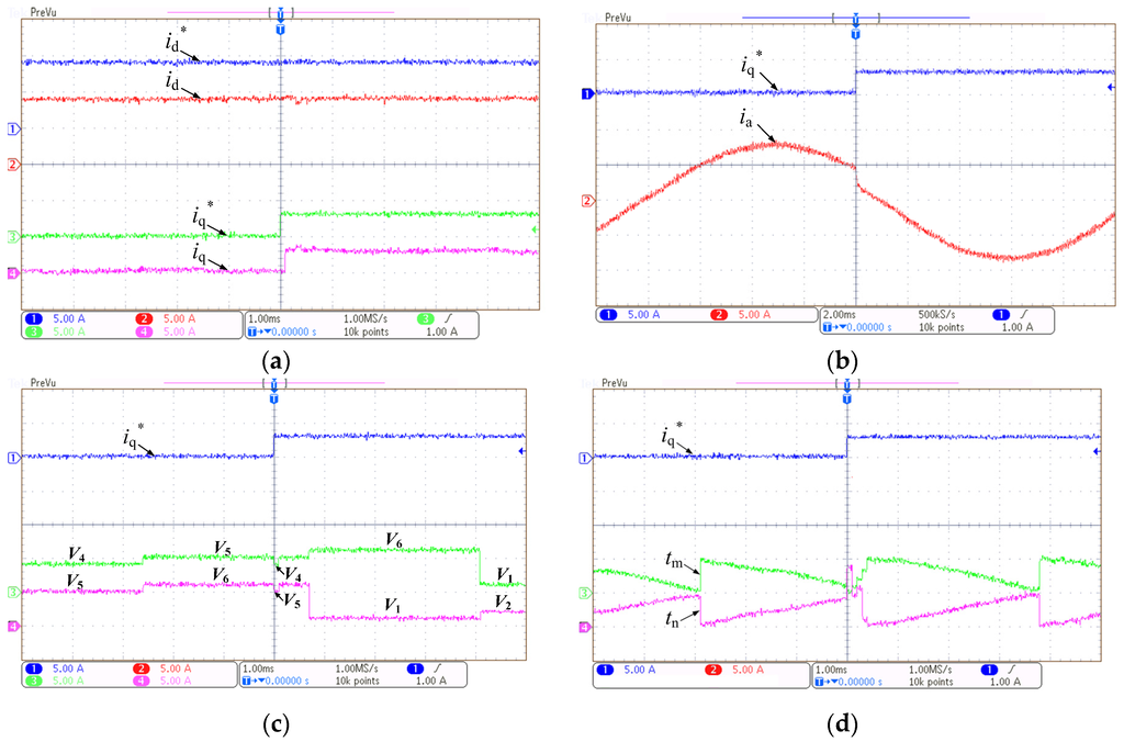 Experimental results: dq-axis currents and Phase A current with iq* step changed from 0 A to 3 A (rectifier mode, Method II, id* = 0 A). (a) dq-axis currents; (b) Phase A current; (c) selected voltage vectors; (d) tm and tn (25 μs/division).
