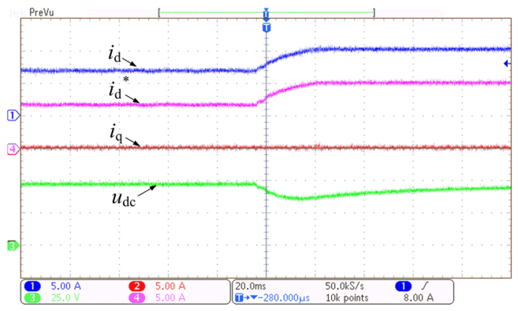 Besides, system transient behaviours with an outer DC-voltage control loop were also tested. Figure 18 demonstrates system transient responses when the converter was operating in rectifier mode and a disturbance was introduced to the resistance load of the DC-link. The control strategy for the DC-link voltage was the typical PI controller, which generated the reference signals for the d-axis current. Additionally, the q-axis current remained zero. As can be seen in the waveforms, the d-axis current can track the reference current in a good way, and the q-axis was not influenced by this transient process, demonstrating the decoupling performances of the proposed controller.