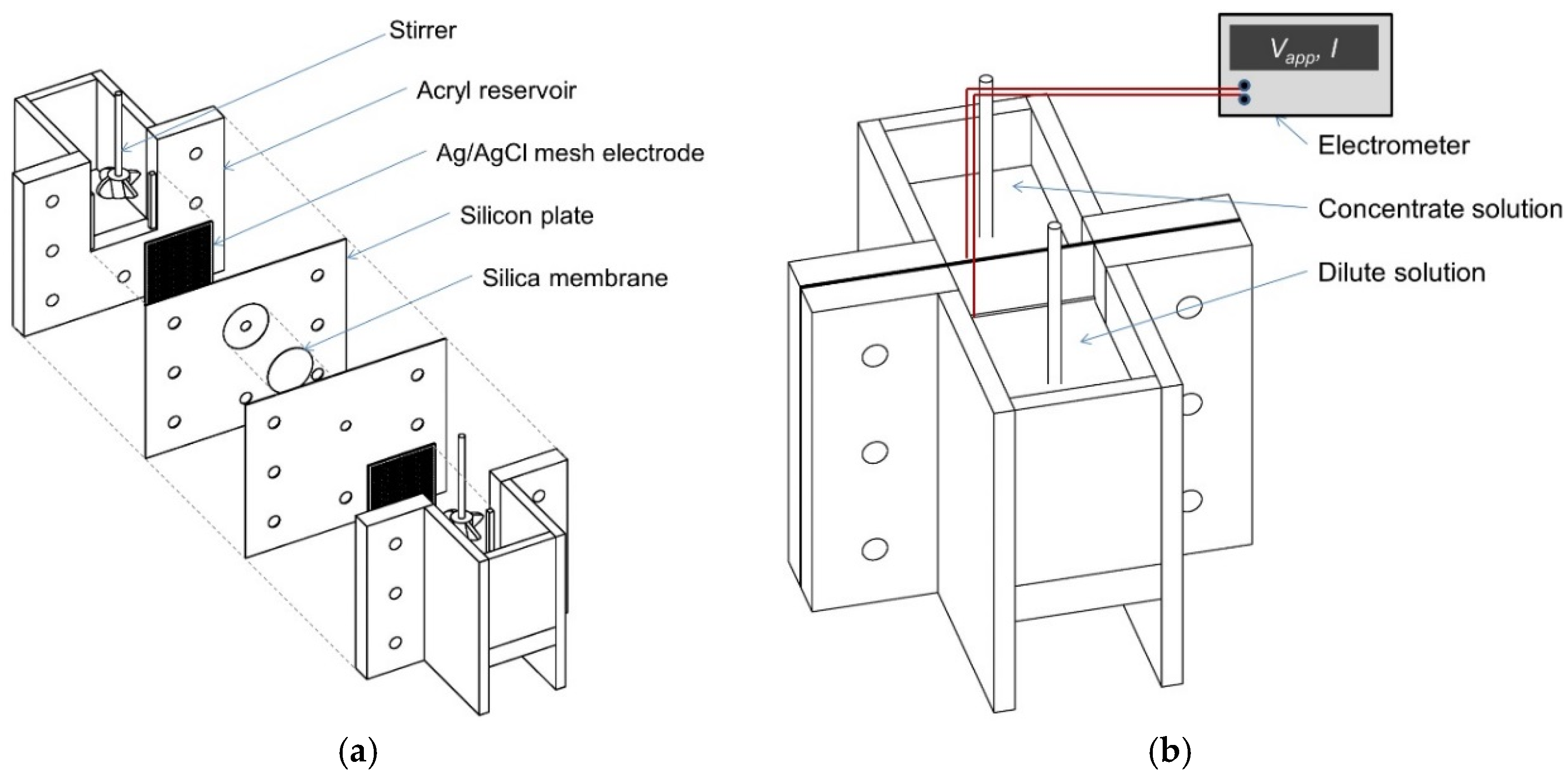R are the potential generated from redox reactions on the electrodes, the diffusion potential of the silica membrane, and the electric resistance of the silica membrane, respectively. The electric potential generated in the silica membrane,